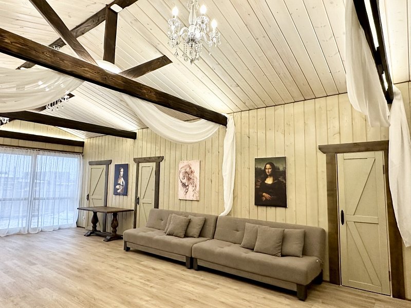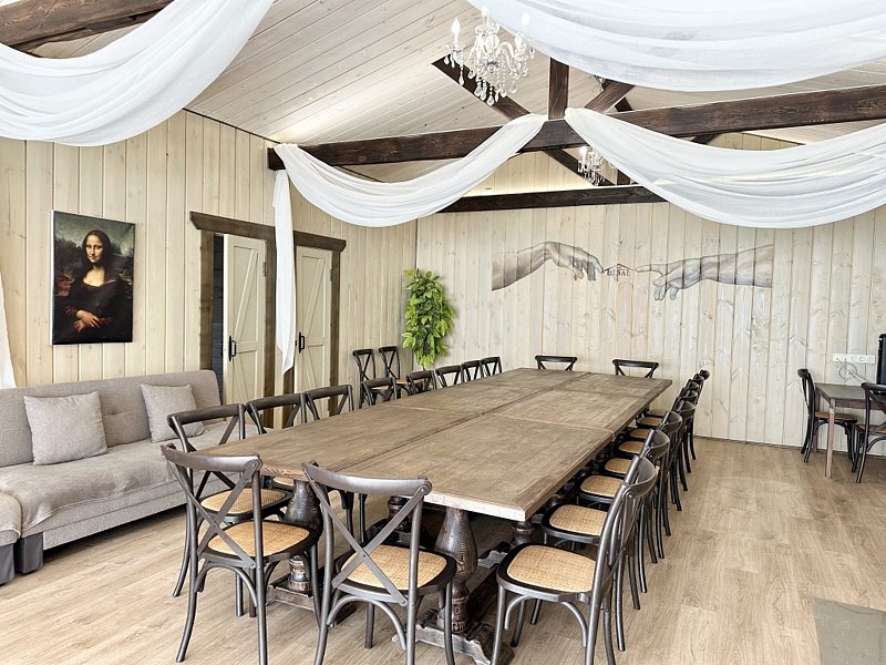 Большой торжественный зал с массивными дубовыми столами и венскими стульями; нарядная тканевая драпировка, хрустальные люстры, настенная роспись и картины будут прекрасным фоном для любого праздника.