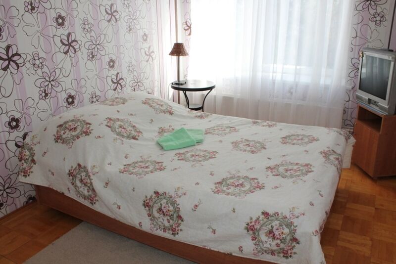 В номере: кровать двуспальная, телевизор, шкаф, балкон, две тумбочки, два светильника.