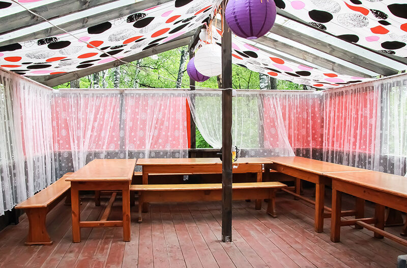 Деревянные столы и скамьи, электричество, вода, мангал, декоративное оформление.
