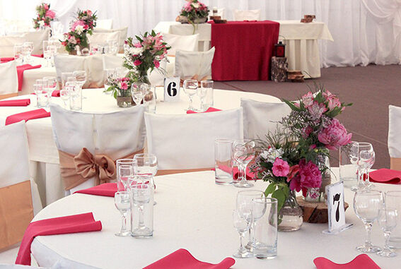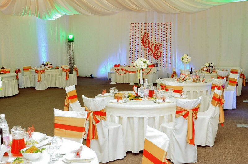 Скатерти, чехлы на стулья, банты.Малый шатер