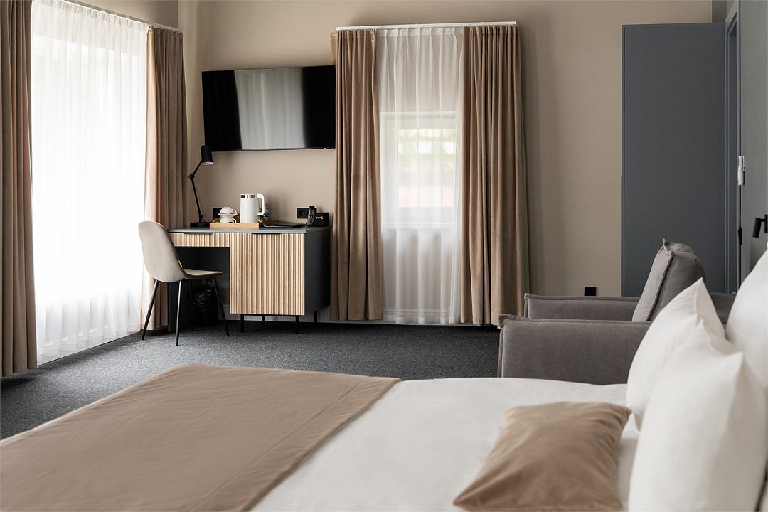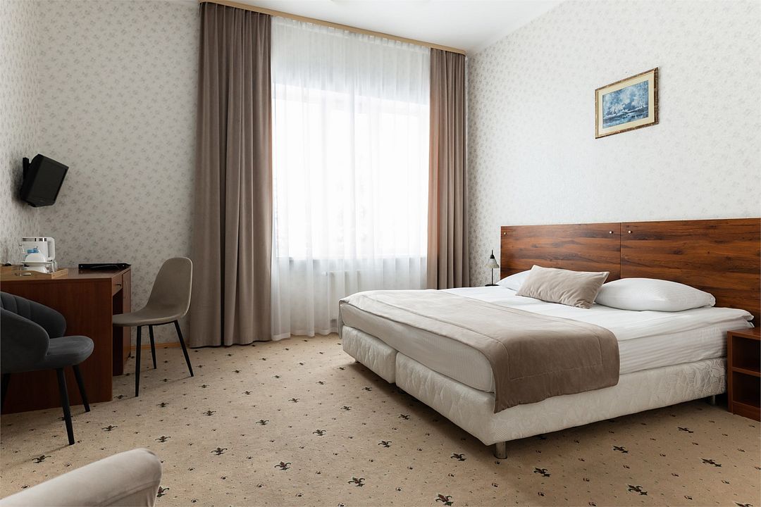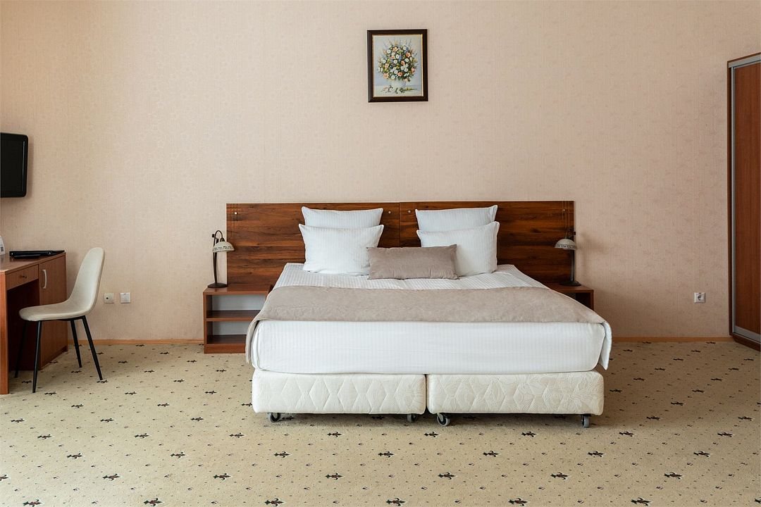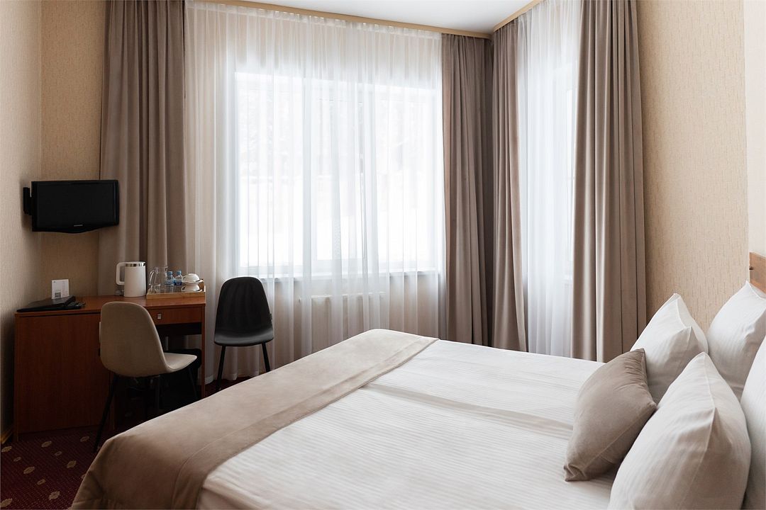 Для размещения гостей предлагаются гостиничные номера от категории «эконом» до категории «люкс», а также вместительный коттедж. Каждое помещение оборудовано санузлом с просторной душевой кабиной, кроватью с удобным ортопедическим матрасом, телевизором, мини баром и сейфом.К услугам гостей работает ресторан и бар.