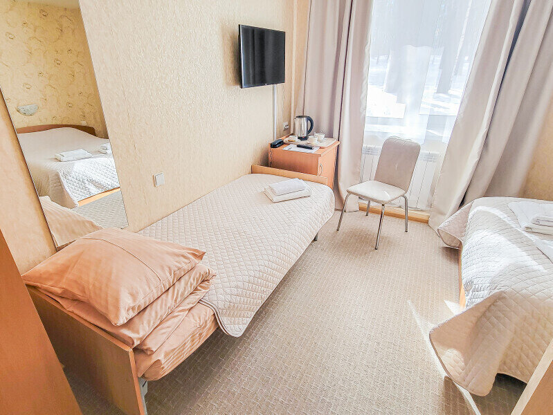 18 кв.м, две односпальные кровати, доп. место - раскладушка, ТВ, с/у душ