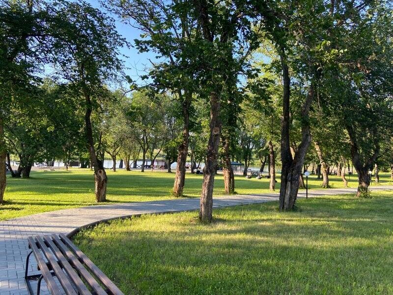 Песчаный пляж на берегу реки Мостовая, оборудован кабинами для переодевания и туалетными комнатами.
