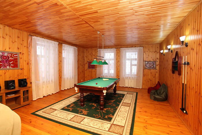 - Просторная гостиная с камином, телевизором, бильярдом, мягкой мебелью;