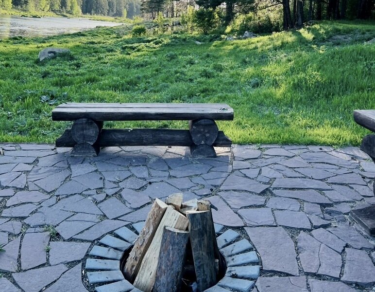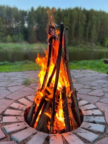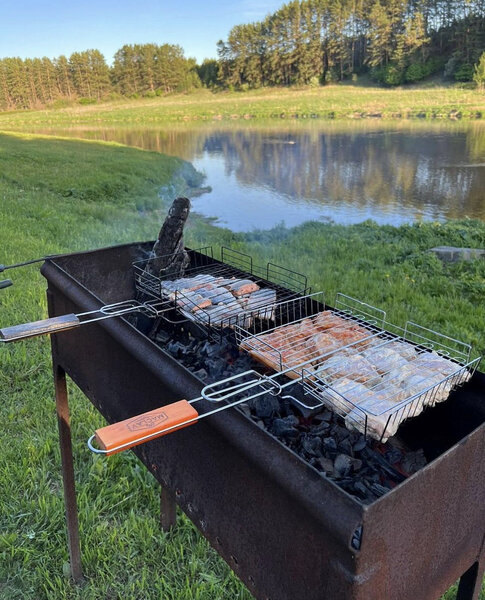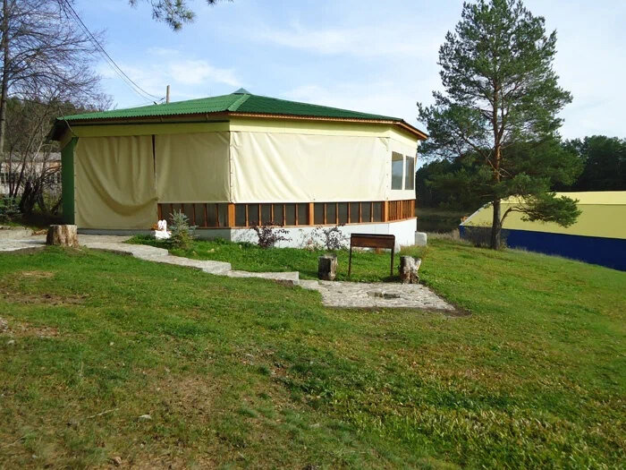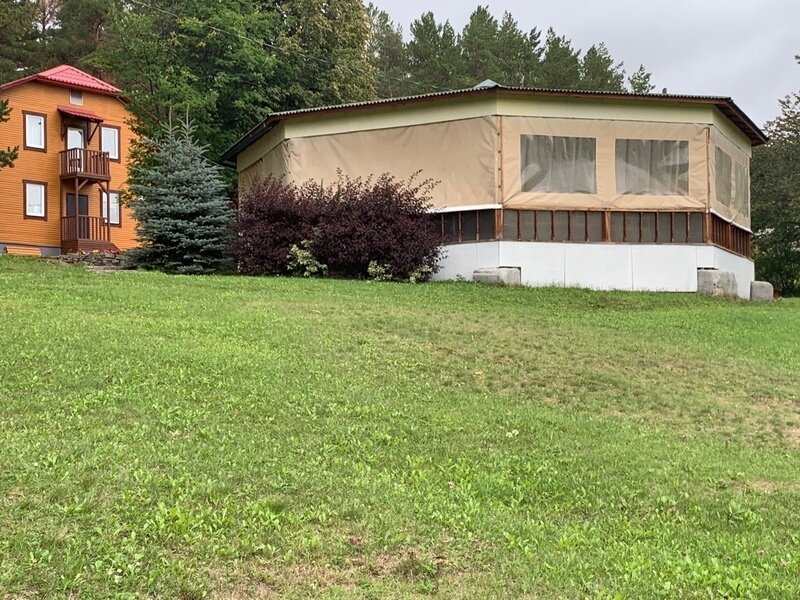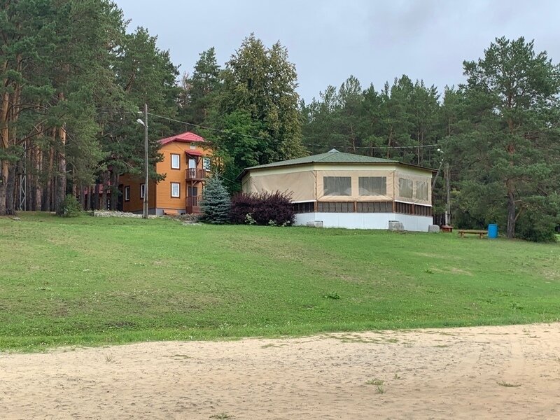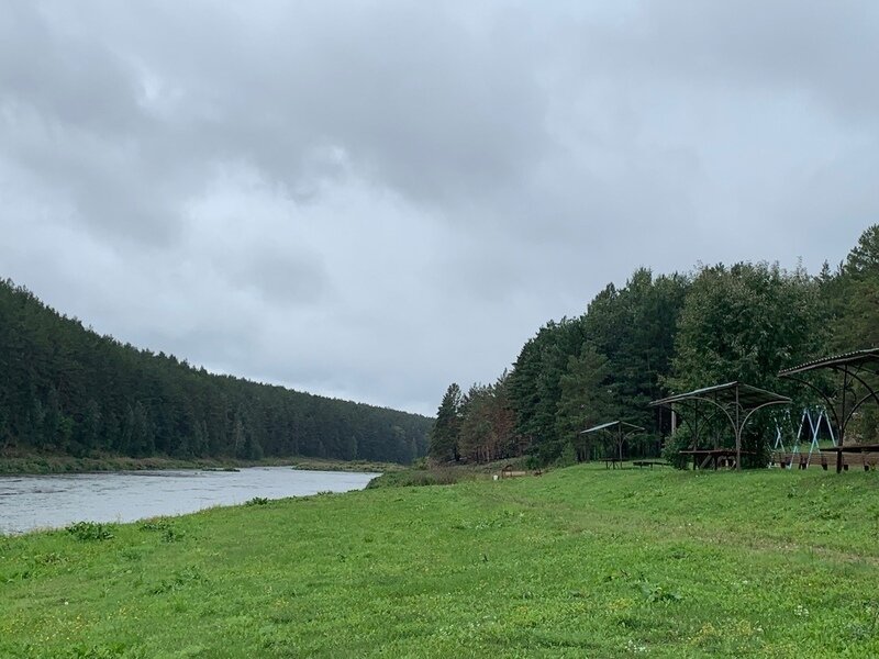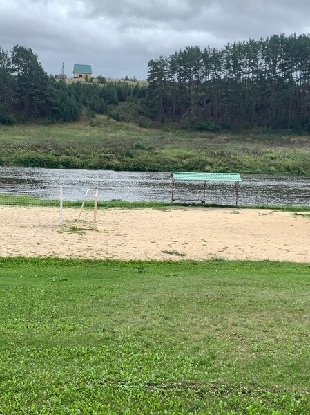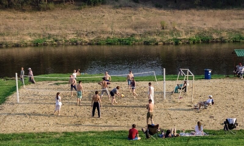 На берегу реки есть волейбольное и футбольное поле, расположены беседки, деревянные качели, канаты и столы для пинг-понга.