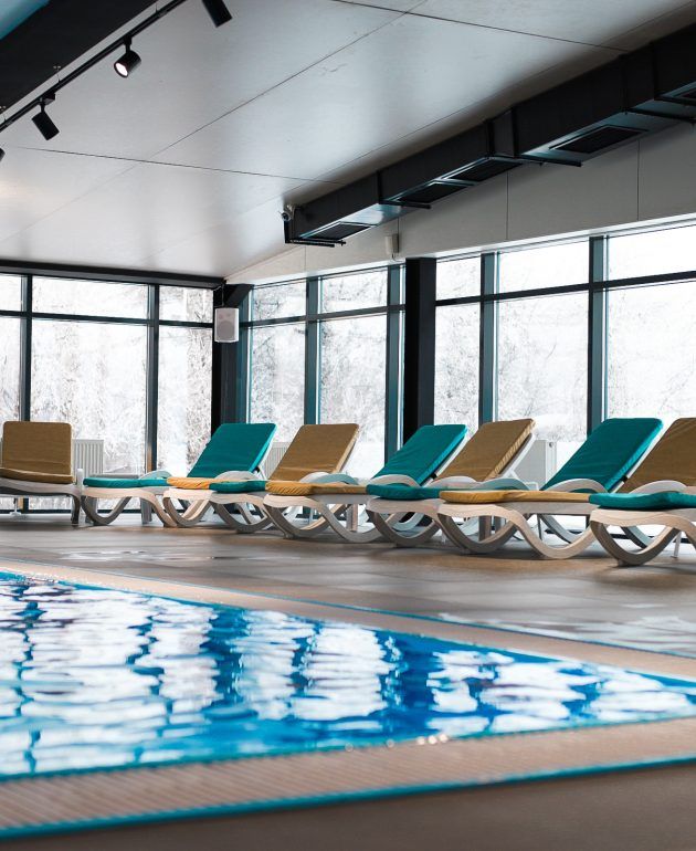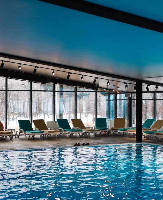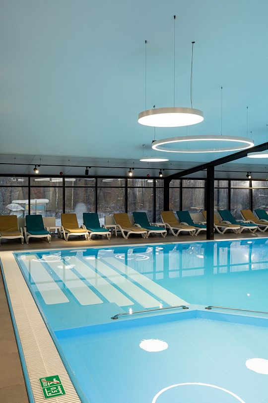 Тип бассейна: крытый бассейнВода в бассейне: подогреваемый бассейнРядом с бассейном: шезлонги, бар у бассейнаТемпература в бассейне: 28 °CВремя работы: от 09:00 до 21.00Глубина (диапазон): от 50 до 150 смПериод работы: круглогодичноУютный СПА-комплекс предлагает прекрасные условия для отдыха — гости могут насладиться купанием в бассейне, а также полюбоваться живописными панорамными видами реки Туры, леса и яблоневого сада, расслабившись на шезлонгах.