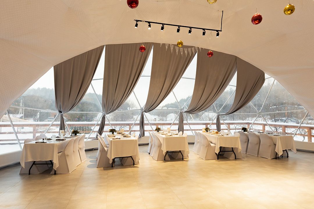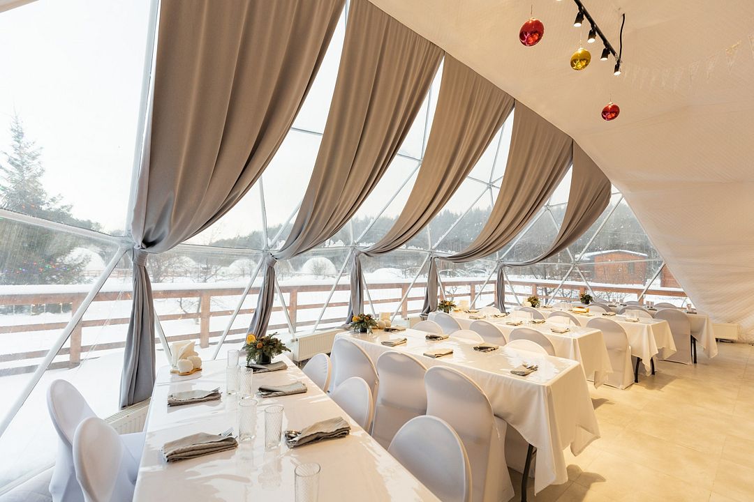 Шатер в загородном клубе «Яблоневый сад» идеально подходит для мероприятий любого формата — от свадебных торжеств до бизнес-презентаций и спортивных занятий. Он вмещает до шестидесяти пяти гостей за банкетными столами и ста тридцати в формате фуршета, а большое панорамное окно открывает захватывающий вид на реку Тура.