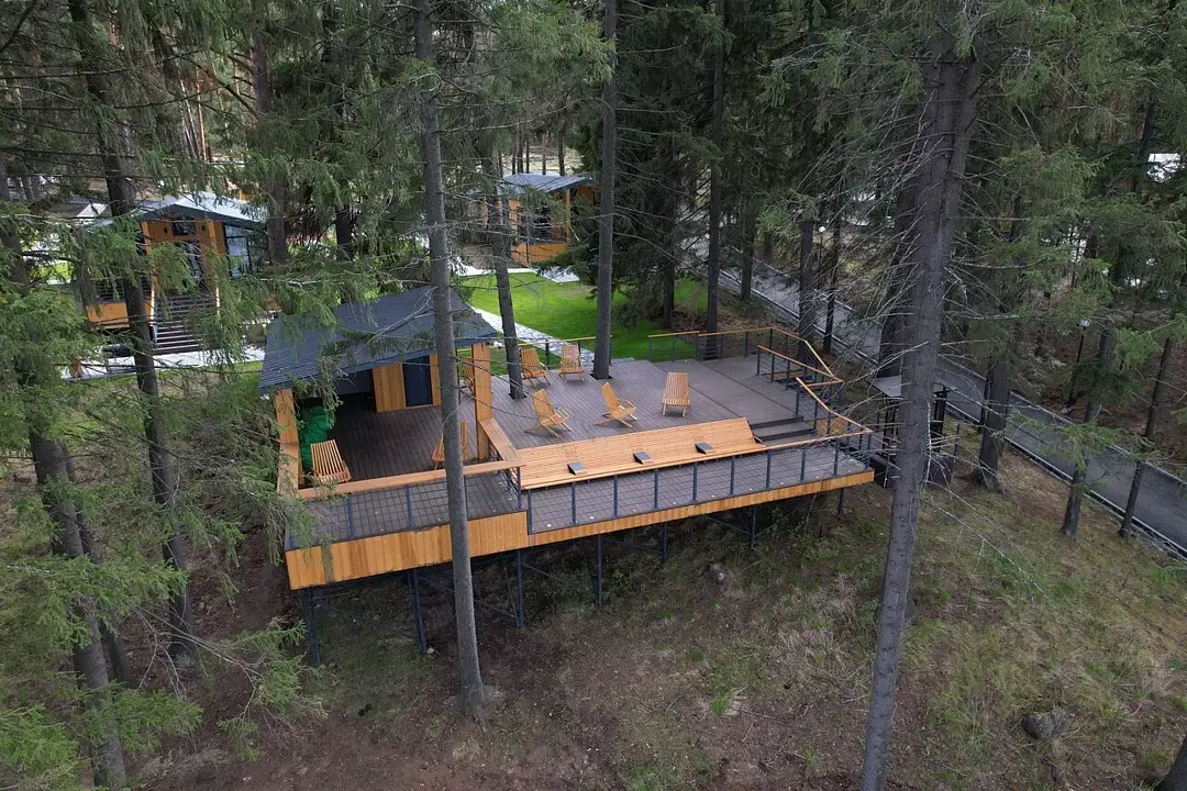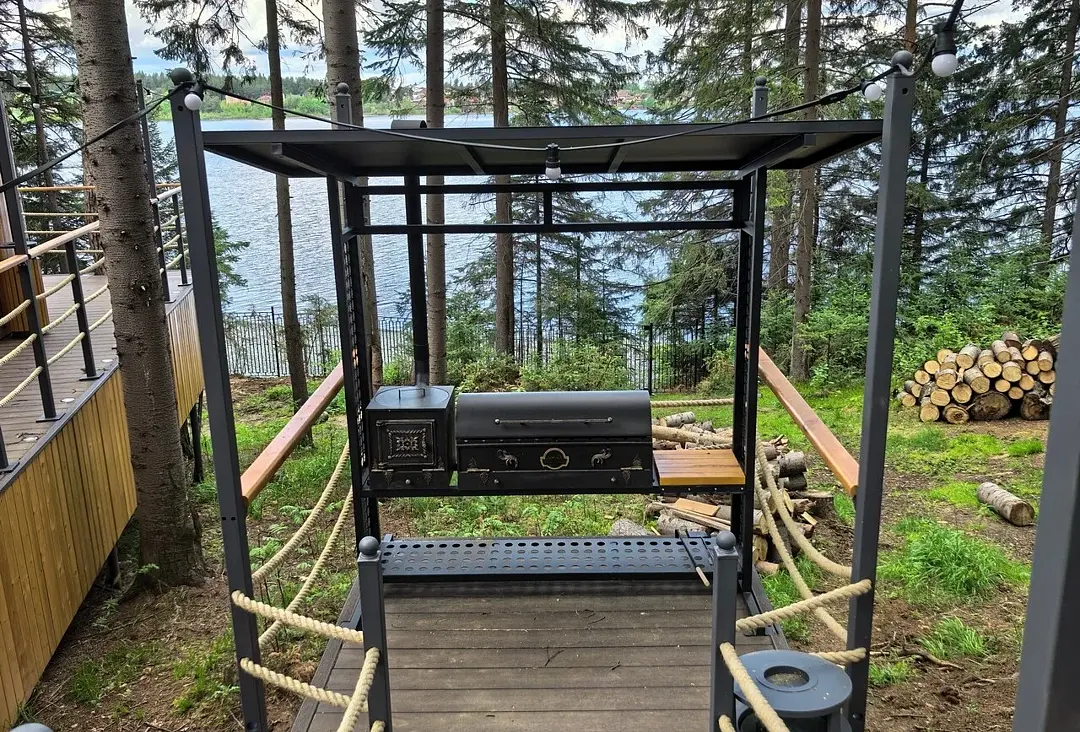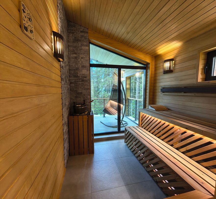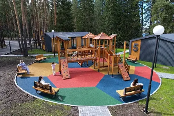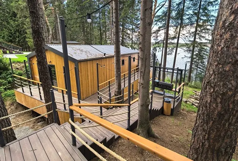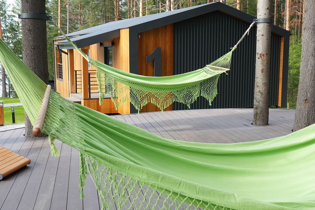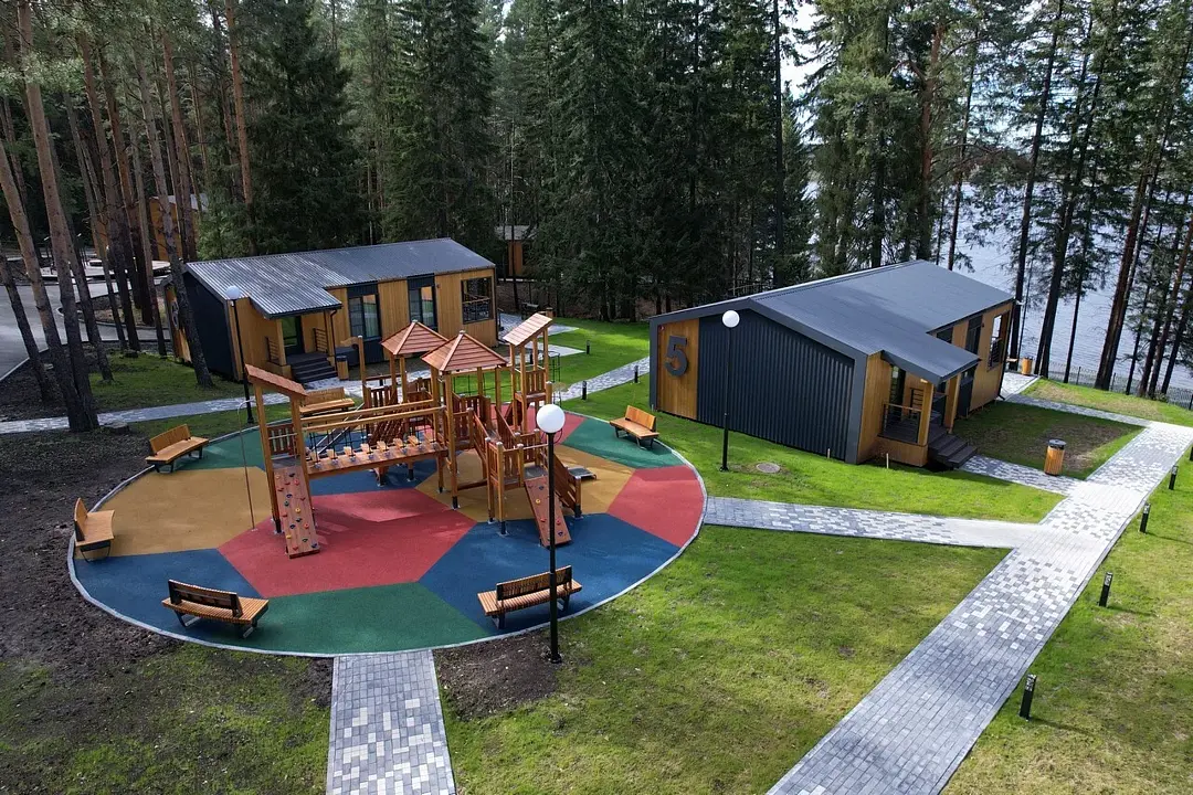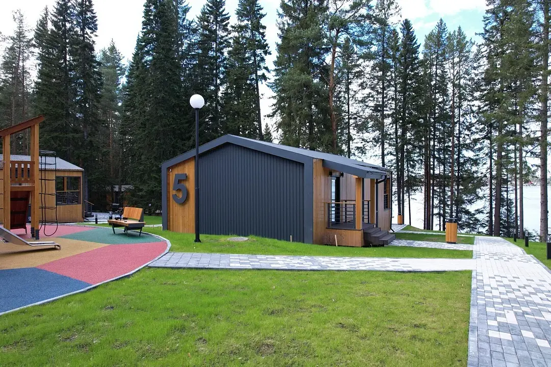Возле каждого домика оборудована удобная мангальная зона с мангалом, барбекю-принадлежностями и печью для казана. Для вашего расслабленного отдыха подготовлена удобная площадка с комфортными качелями, шезлонгами и уютными гамаками под открытым небом. Для всех семей с детьми в комплексе организована просторная и безопасная игровая зона. Также в распоряжении гостей настоящая русская баня с горячей купелью на дровах и видом на водохранилище.
