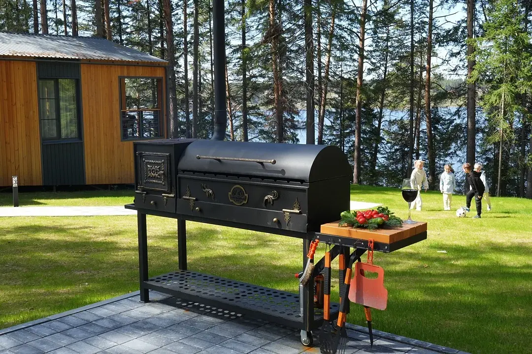 Удобная мангальная зона возле каждого домика. В ней установлен мангал с барбекю-принадлежностями и печь для казана.