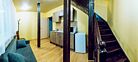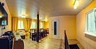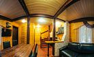 На первом этаже расположен банкетный зал вместимостью до 20 человек с настоящим французским камином, 4 стола (160×80 см) и 1 стол (120×80 см), а также кухня, оборудованная всей необходимой техникой и посудой на 20 персон, спальная комната и санузел с душем.