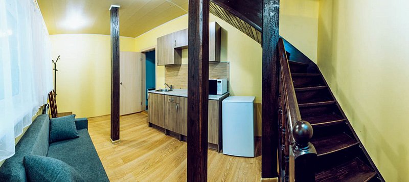 На втором этаже находится банкетный зал вместимостью 10 человек, отдельная спальня с двуспальной кроватью, два дивана, цифровое ТВ и караоке. В распоряжении гостей дома — 4 стола (160×70 см).