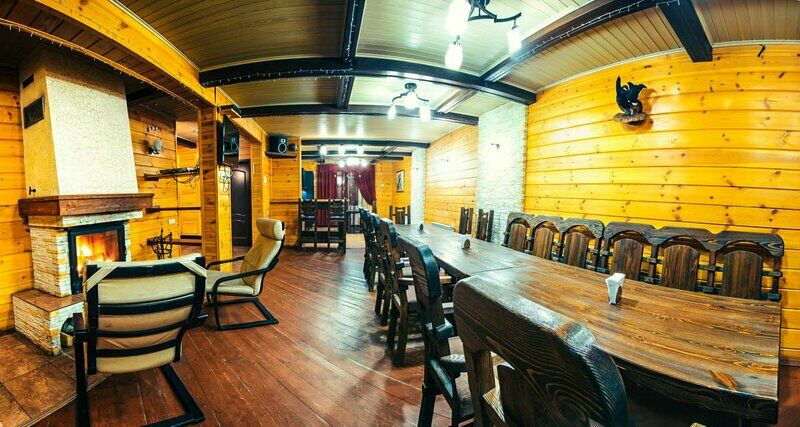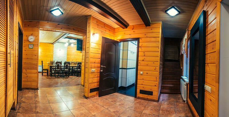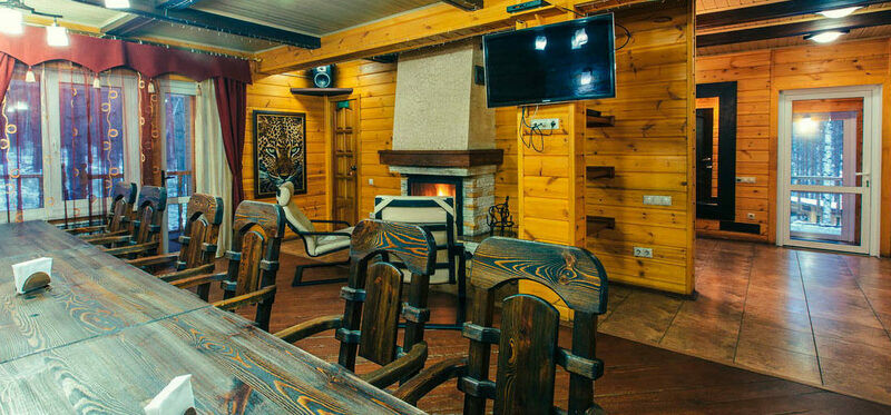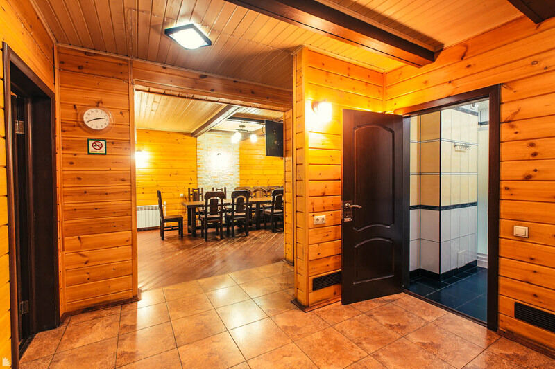 На первом этаже коттеджа расположены русская баня с отапливаемым бассейном, банкетный зал вместимостью до 30 человек (5 столов 160×80 см) с настоящим французским камином, санузел и кухня, оборудованная всей необходимой техникой и посудой на 30 персон.