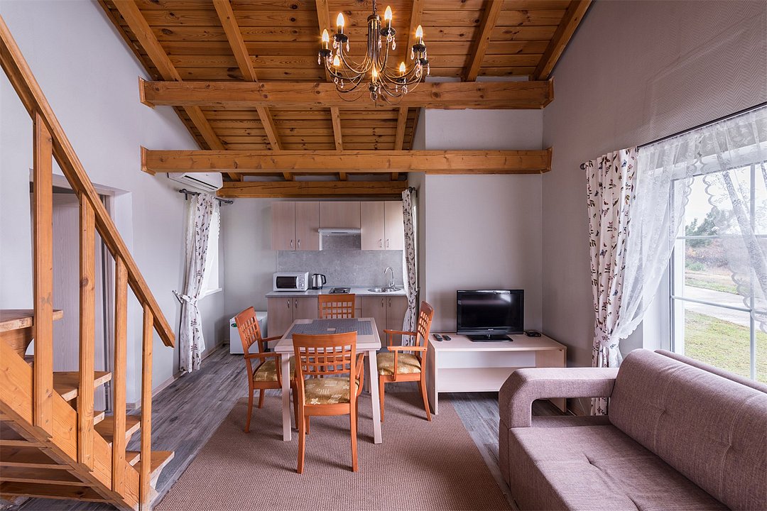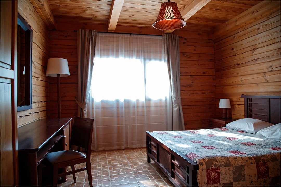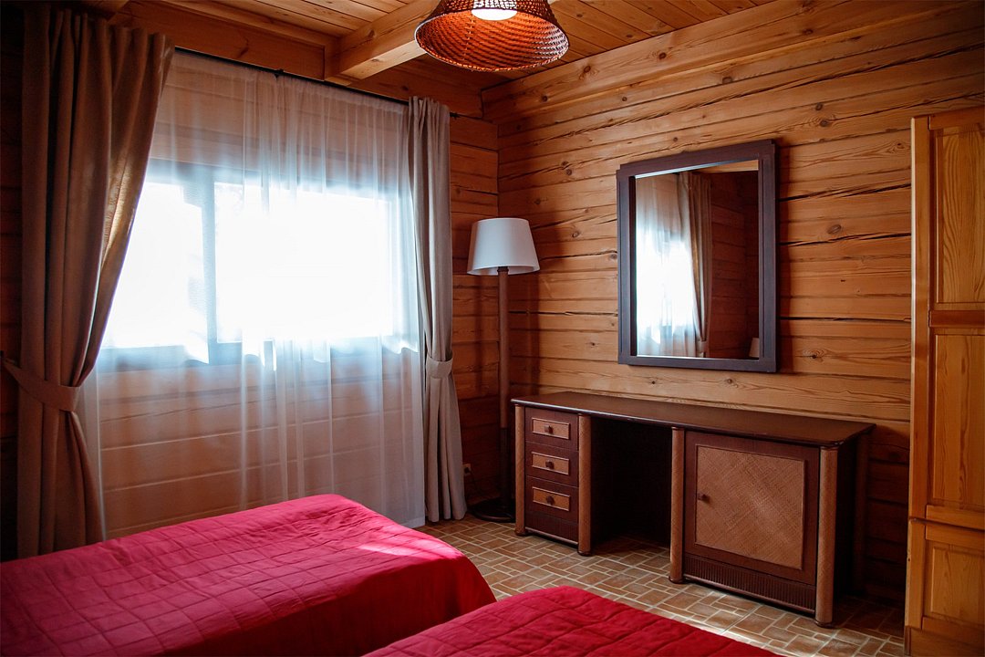 Дом с 2 спальнями (в обоих спальнях две раздельные кровати), с кухней, без сауны. Находится в 4-х километрах от основной территории. Вам нужен личный автомобиль, чтобы добраться до горнолыжных трасс или кафе.