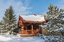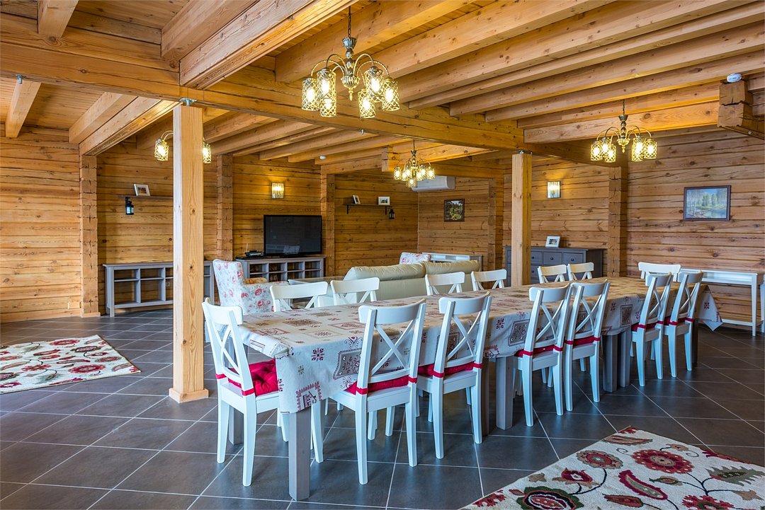 Дом для большой компании — 9 спален, финская сауна, купель с панорамными окнами с видом на реку, караоке и бильярд. Находится на нижнем плато, рядом с горнолыжным подъемником.