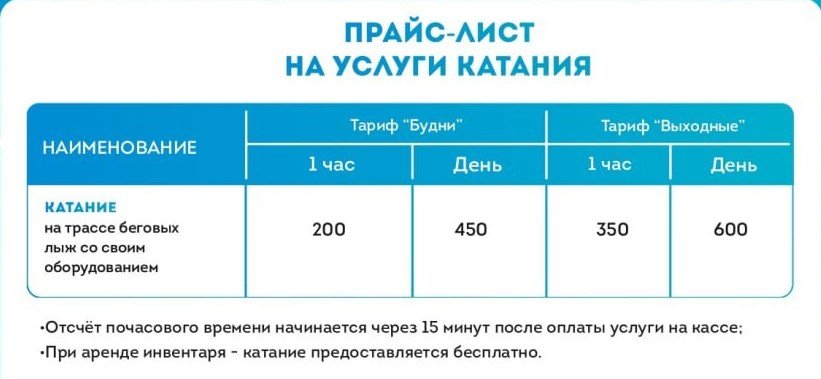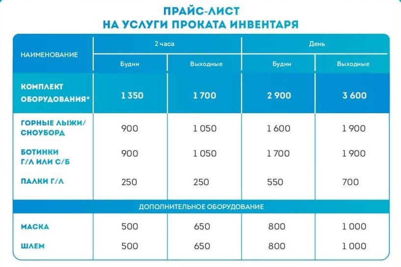 Выдача оборудования в прокат заканчивается за 1 час 30 минут до окончания работы горнолыжного комплекса.