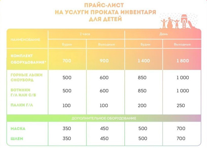 Услуга проката инвентаря для детей до 12 лет включительно предоставляется с предъявлением свидетельства о рождении ребёнка.