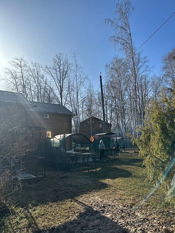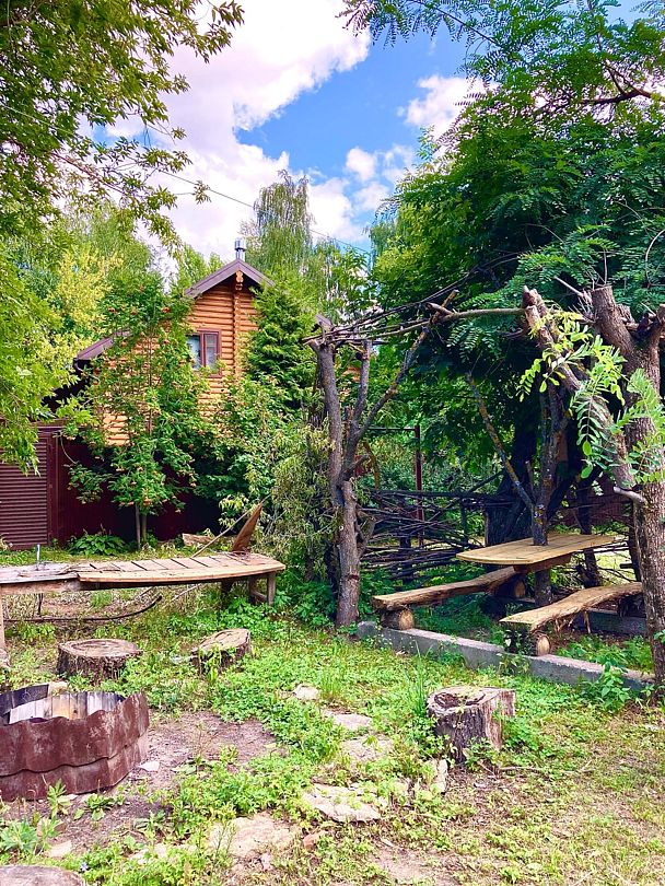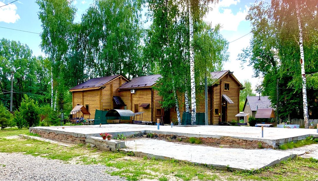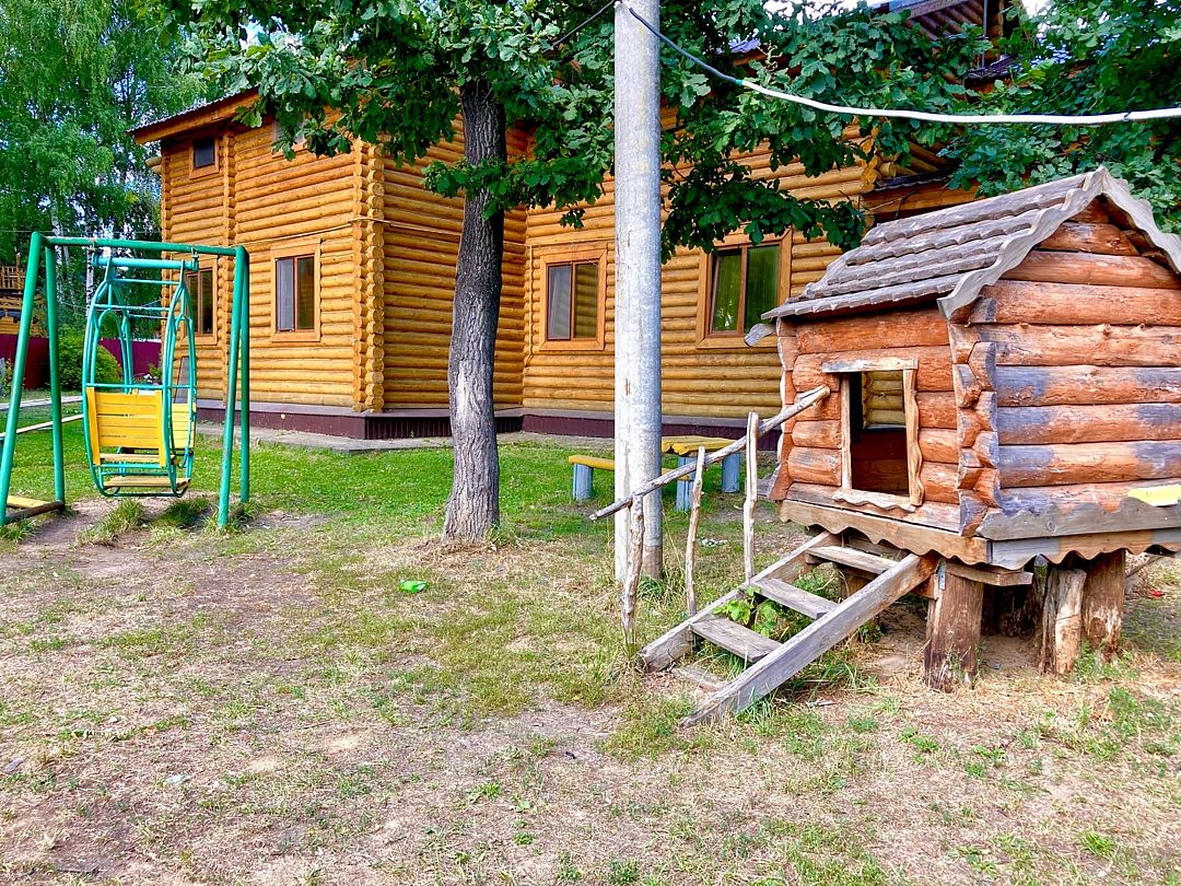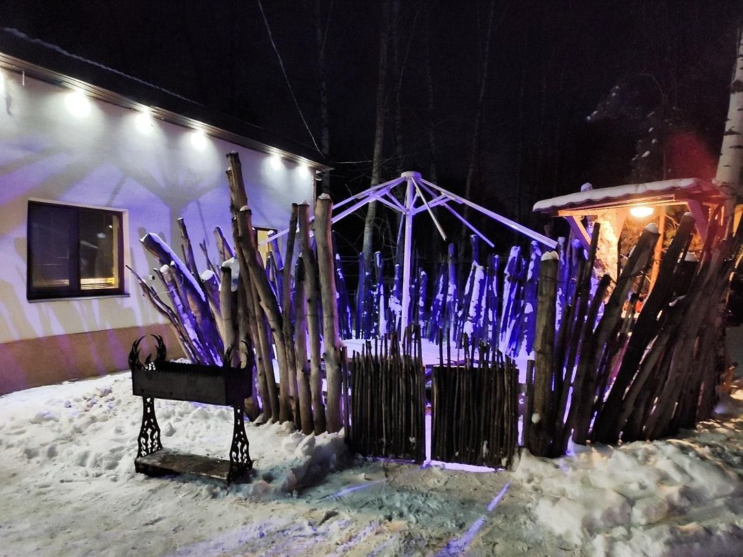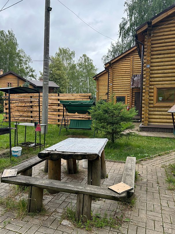 Двухэтажный сруб с отгороженной территорией, где имеется мангальная зона и столы. За дополнительную плату можно арендовать баню или банный комплекс (минимум 2 часа).