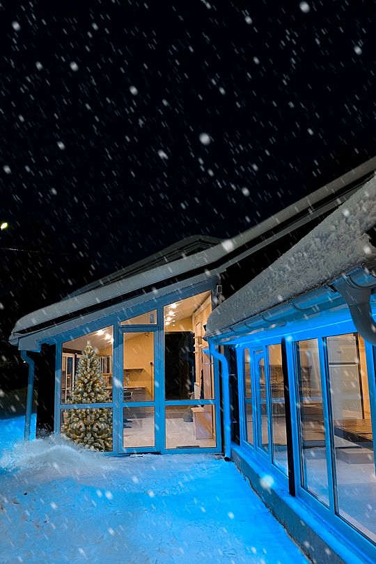 Одноэтажный домик с верандой с панорамными окнами.