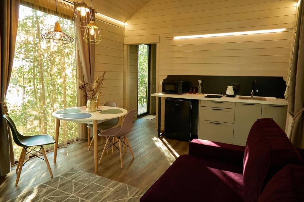 На территории глэмпинга есть мангальные зоны, лежаки и гамаки, где можно отдохнуть. Также доступна аренда рыболовного снаряжения и сапбордов. Разрешено проживание с животными. Гости могут насладиться прогулками по живописным тропам, заняться рыбалкой, покататься на сапбордах и поиграть на свежем воздухе. Зимой на озере открывается каток. Рядом с глэмпингом расположена конная ферма, где можно организовать прогулку на лошадях по лесу. В окрестностях работают кафе, предлагающие разнообразные кулинарные блюда, включая грузинскую и восточную кухню. Также для гостей в отеле: сауна.