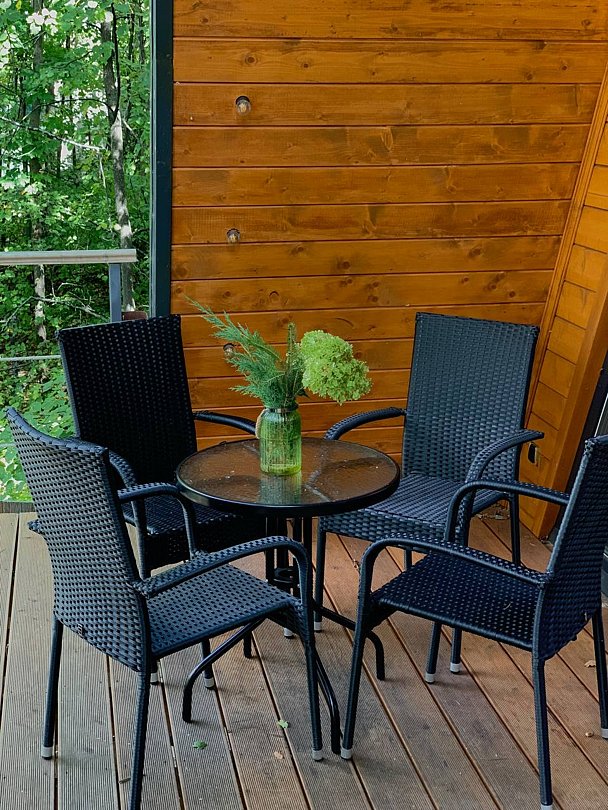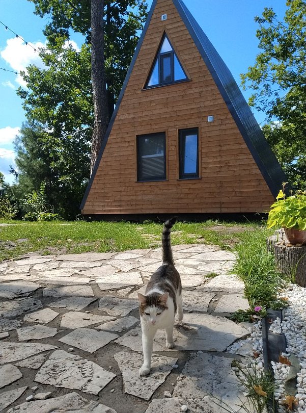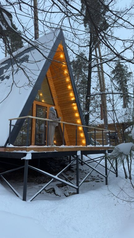 Дома a-frame рассчитаны на размещение до 6 человек и имеют площадь 54 м². Большое панорамное окно с видом на озеро и терраса.