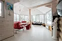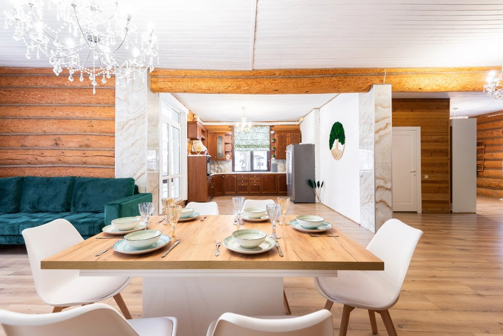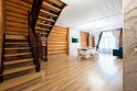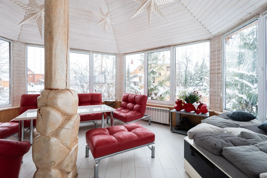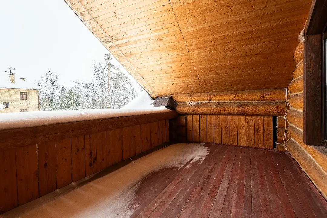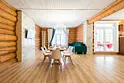Деревянный дом из сруба с современным дизайном. Изюминка дома - это панорамная веранда с видом на озеро.