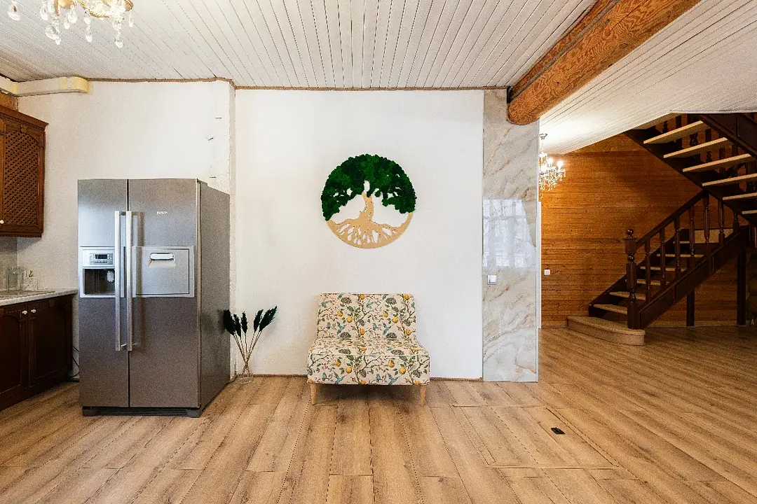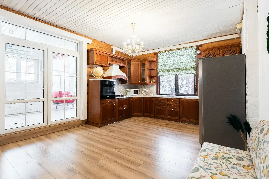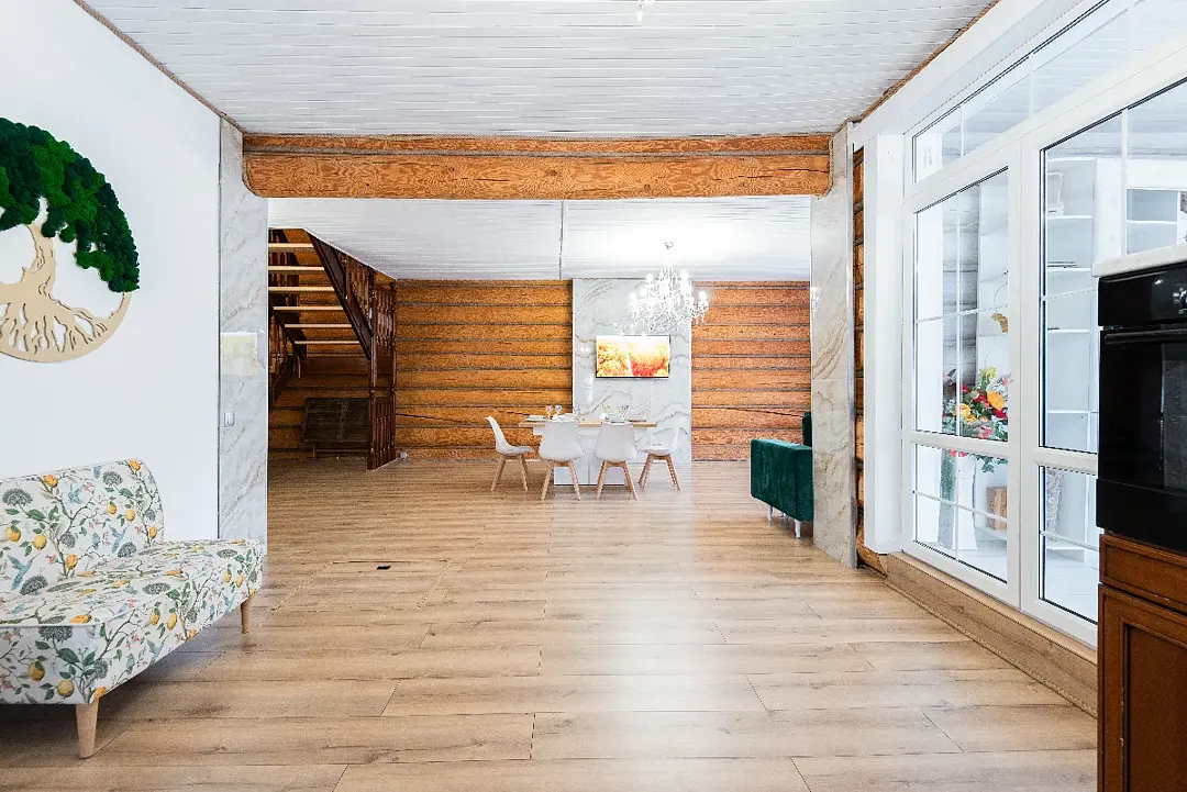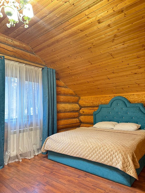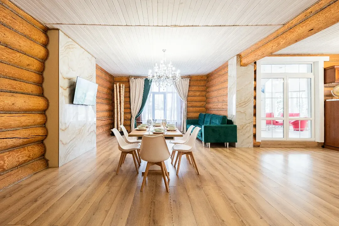 Деревянный дом из сруба с современным дизайном. 5 спальных комнат с большими двуспальными кроватями (при необходимости в нескольких спальных комнатах можно разделить на односпальные), вместительная гостиная, кухня и две душевые комнаты. Идеaлeн для oтдыха большой компанией или сeмьей.