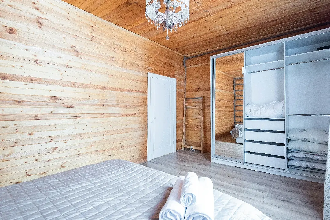 В доме есть отдельная спальная комната с дверью на первом этаже, спальная на втором этаже, раскладной диван в гостиной. Комфортные ортопедические матрасы, мягкие подушки и воздушные одеяла.