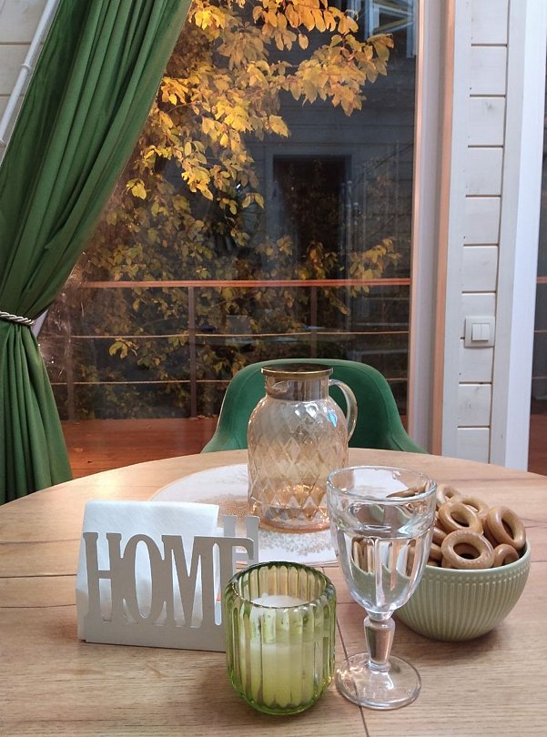 Всё необходимое для отдыха имеется в домике. На кухне: набор столовой посуды, бокалы, столовые приборы, сковорода, кастрюли, дуршлаг, терка, салатники, кружки, заварочный чайник, ножи, доски, штопор и др.). Растительное масло, соль, перец, сахар, чай, кофе. Предусмотрена каждая мелочь, которая может понадобится в любой момент.