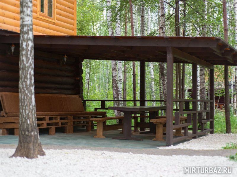Двухэтажный бревенчатый дом с баней и бассейном. Рядом с домом устроена беседка с мягкими лежаками, качелями и мангалом.
