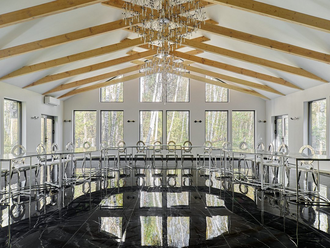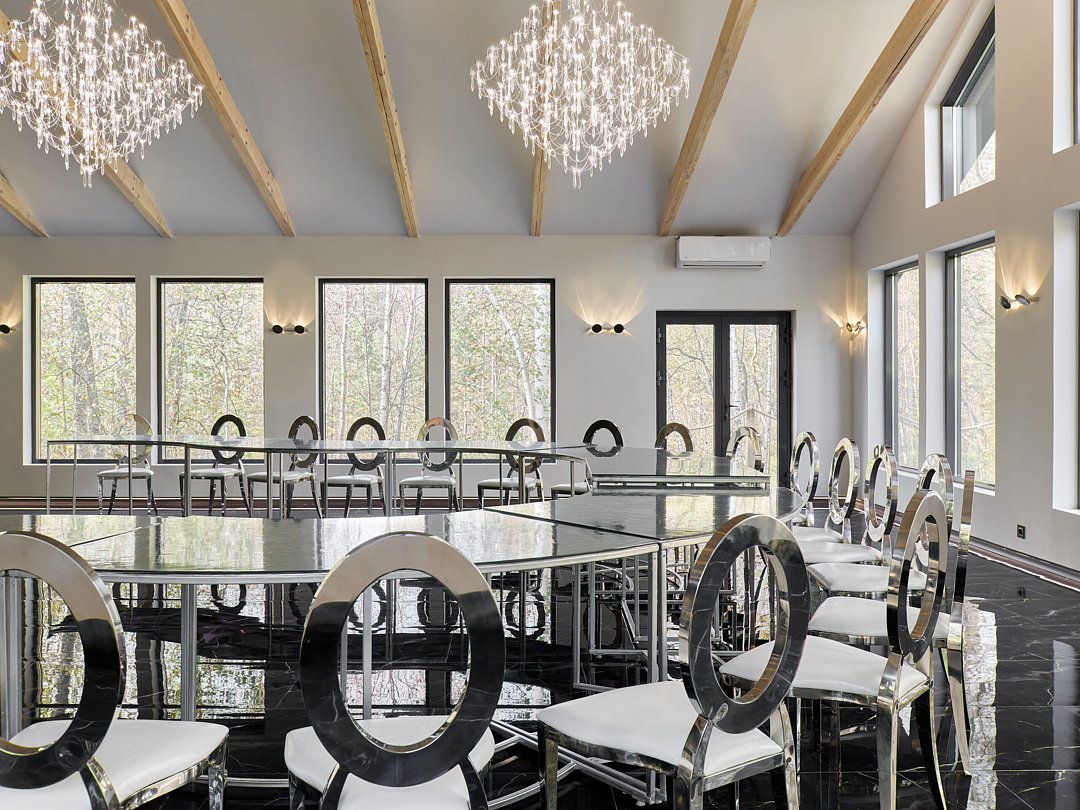 Элегантный банкетный зал «Шелест» площадью 189 м² и панорамными окнами предлагает уникальную атмосферу для мероприятий. Зал может принять до пятидесяти гостей и идеально подходит для свадеб, юбилеев или деловых встреч.