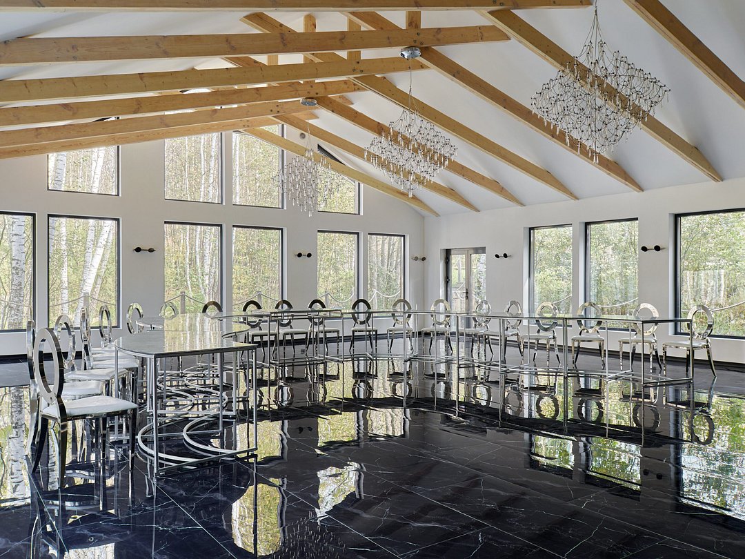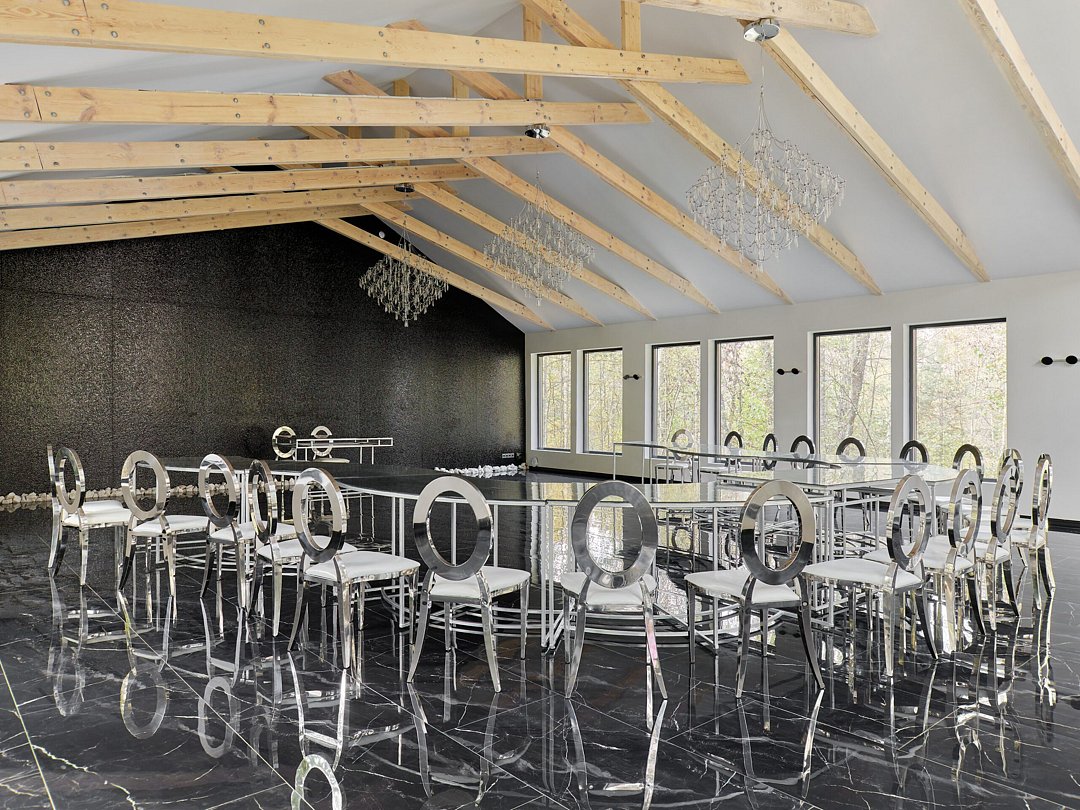 Аренда включает зал с банкетной расстановкой (выбор между шестью круглыми столами или тринадцатью зеркальными, пятьдесят стульев), три гостевых туалета, санузел и комнату для персонала, гримерную, гардероб, мангальную зону и уличную террасу у озера для выездной регистрации.