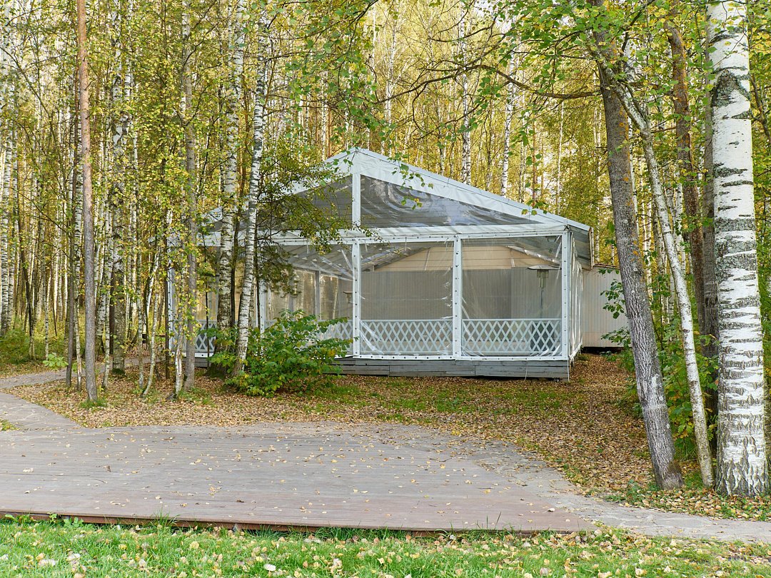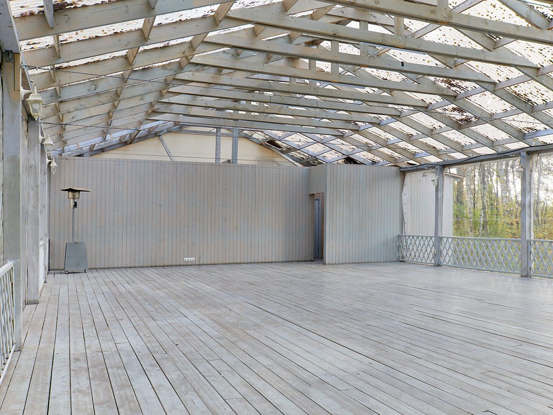 Летняя веранда — просторная площадка 150 м² на берегу озера с панорамным видом и уютной, романтичной атмосферой, идеально подходящая для летних праздников и выездных церемоний; вмещает до 90 гостей.