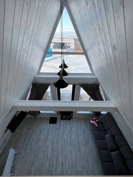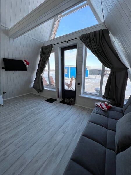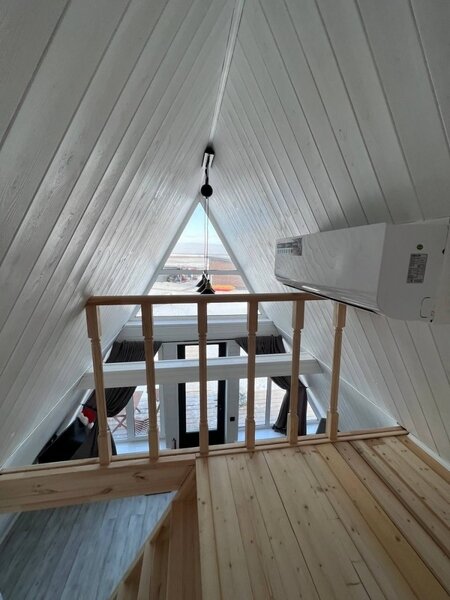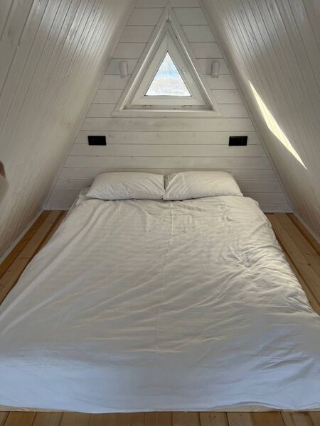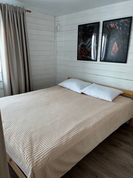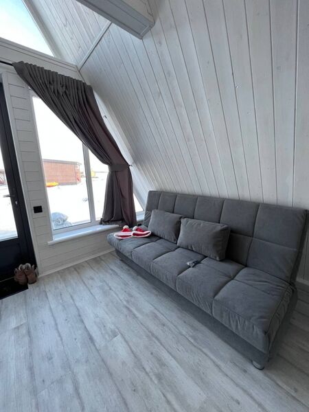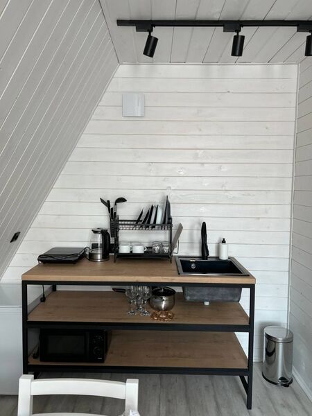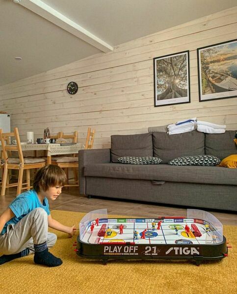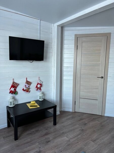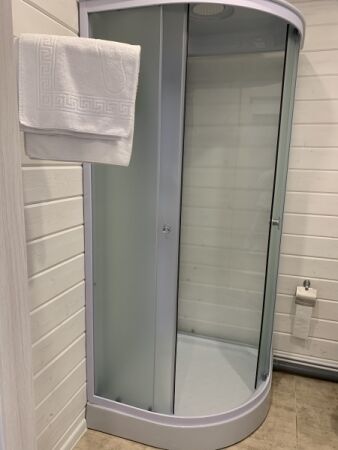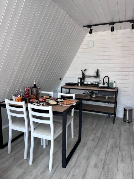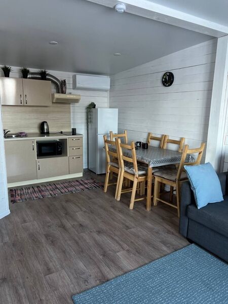В доме: ванная комната с тёплым полом (умывальник, унитаз, душевая кабина), диван-кровать на 2 спальных места, шкаф, стол с 6 стульями, журнальный столик, телевизор, холодильник, микроволновая печь, чайник, кухонная зона с индукционной плитой и полным набором посуды на 6 человек (вилки, ложки, тарелки, чашки, кастрюля и сковорода).