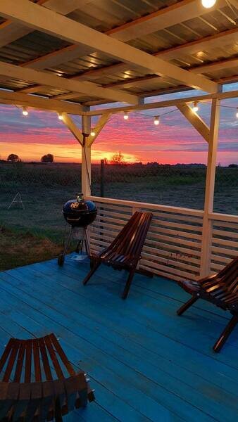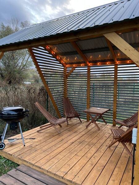 На территории глэмпинга, есть зона патио с лежаками, скамейками и костровой чашей.