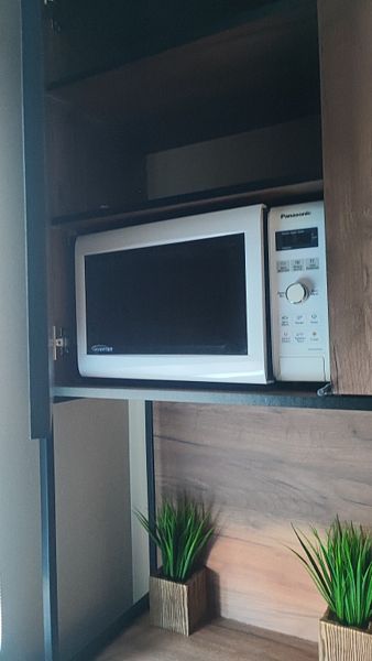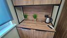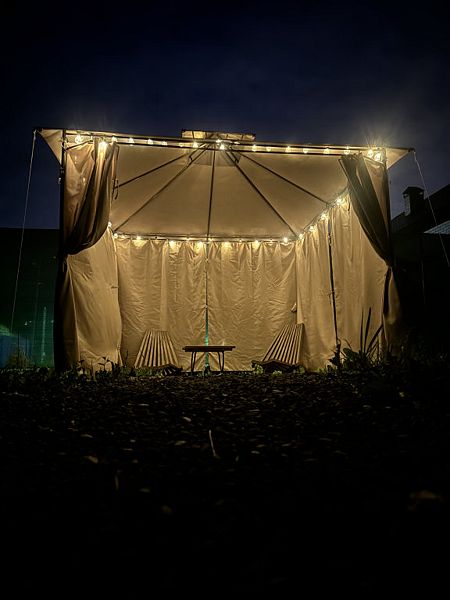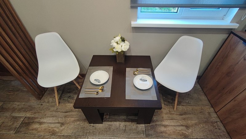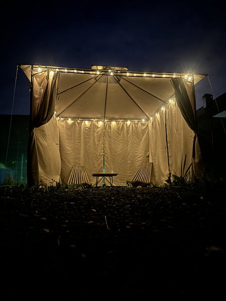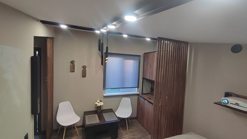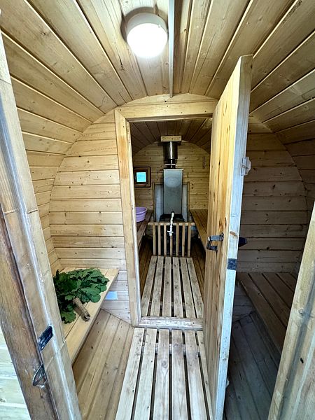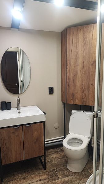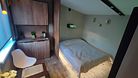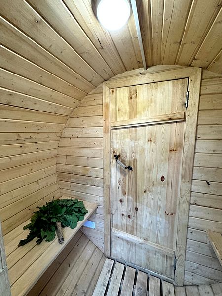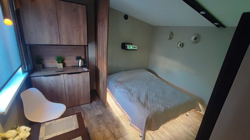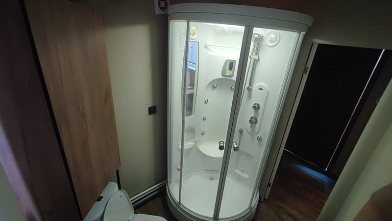 Внутри: большая двуспальная кровать с ортопедическим матрасом Ascona (160x200 см), душевая кабина с функцией хаммама, проектор для просмотра фильмов с качественным звуком, чайник, санузел, холодильник, микроволновка и небольшие, но приятные удобства.