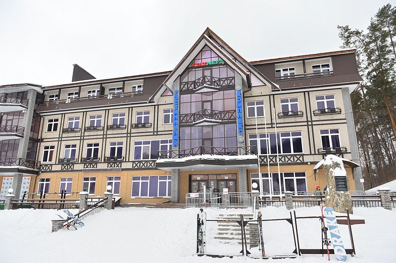 К зданию гостиницы Горнолыжного комплекса примыкает трехэтажное здание общественного питания, связанное с гостиницей теплым переходом на уровне второго этажа.