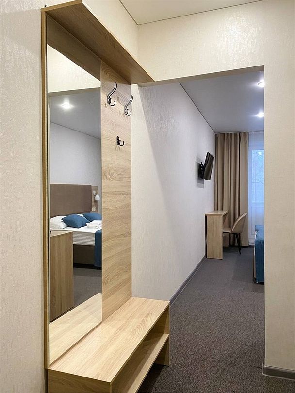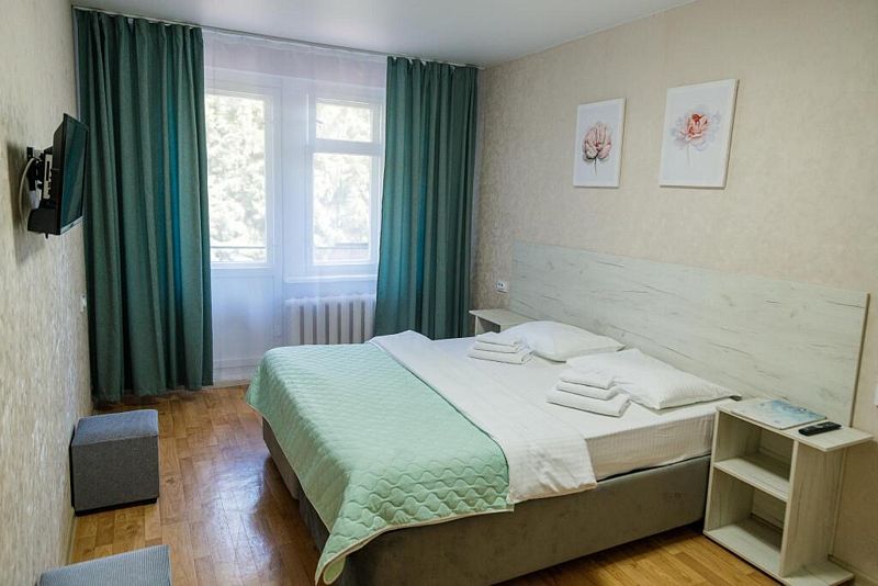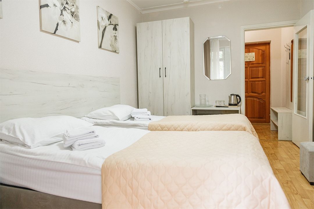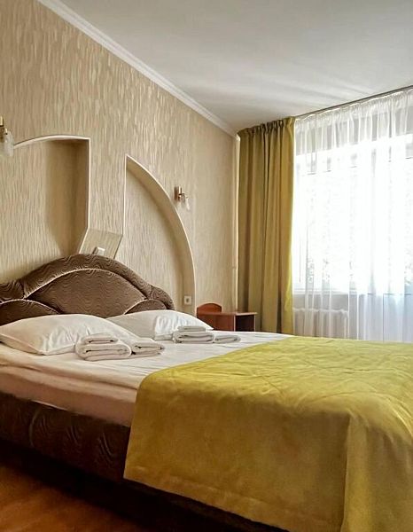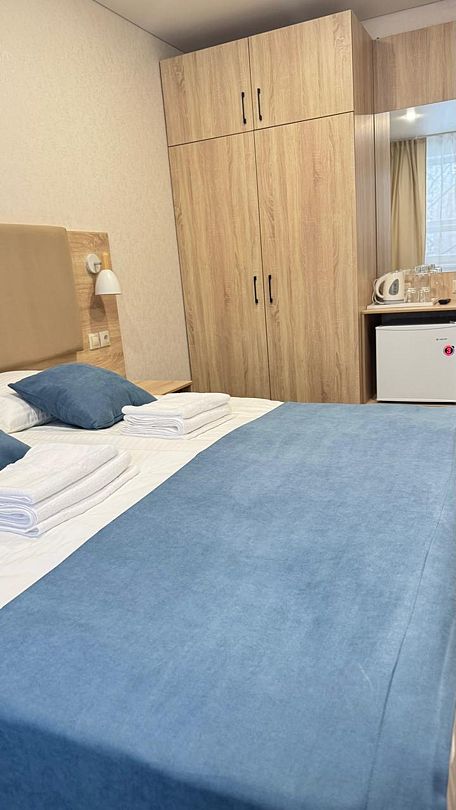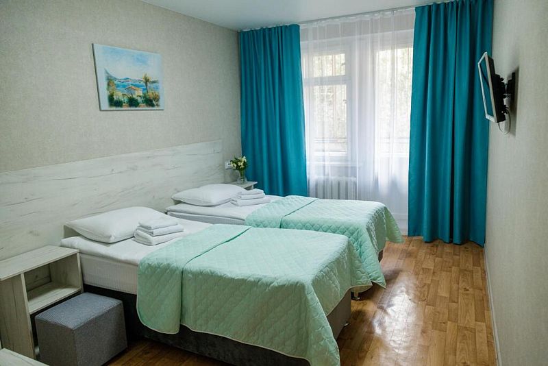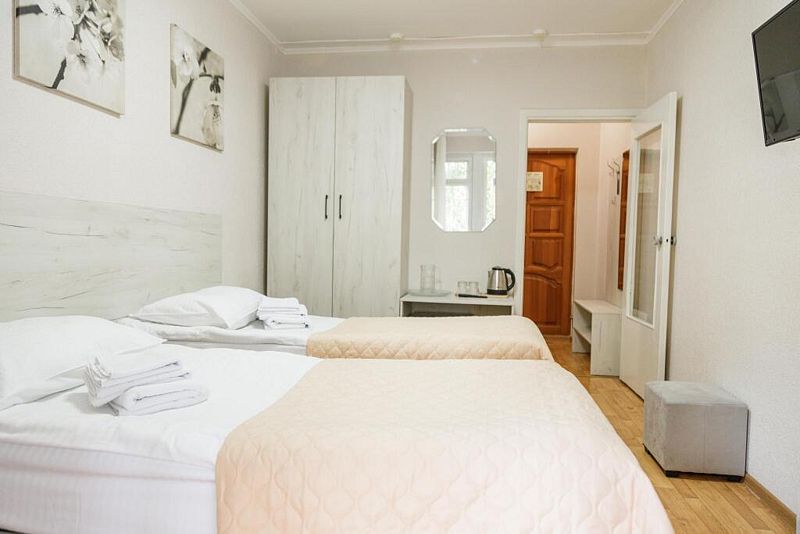 Уютный просторный номер после ремонта с новой мебелью позволяет проживать как двоим отдыхающим, так и одному. Имеются номера с двумя совмещенными односпальными кроватями.