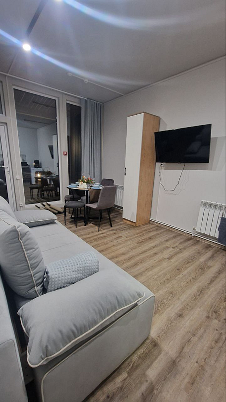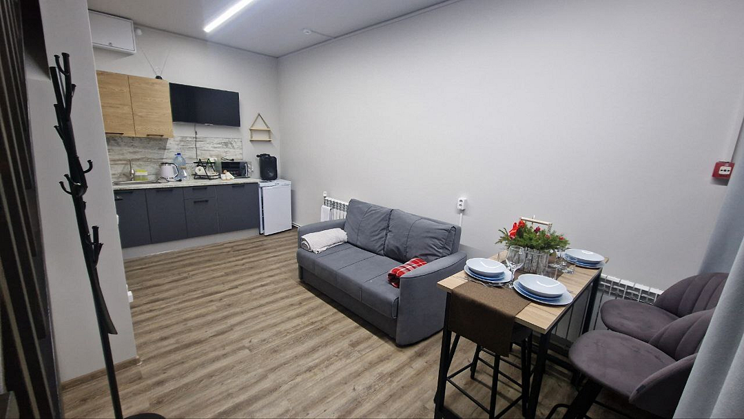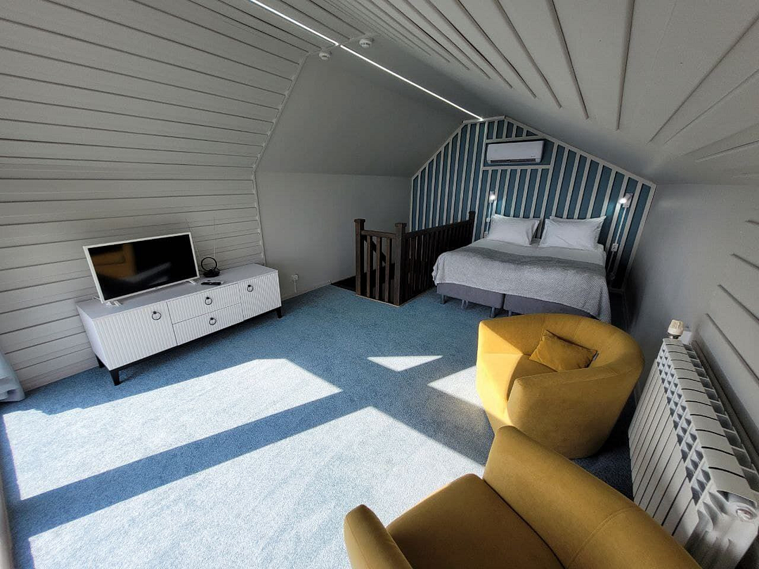 В домике есть: Wi-Fi, телевизор с функцией смарт, музыкальная колонка с караоке, холодильник, микроволновая печь, чайник, посуда, вода, чай, кофе, соль, перец, сахар, спальные места повышенной комфортности, гигиенический набор, халаты, тапочки.
