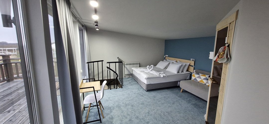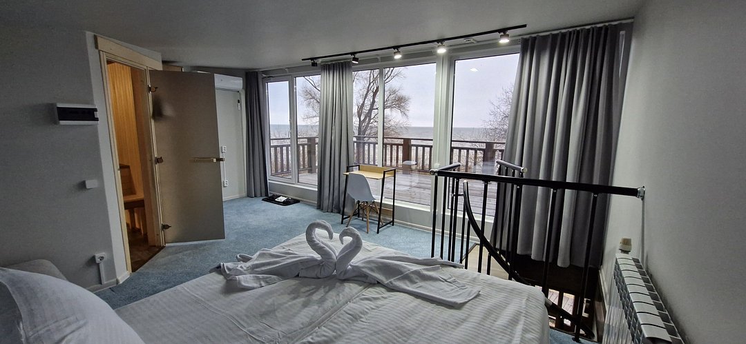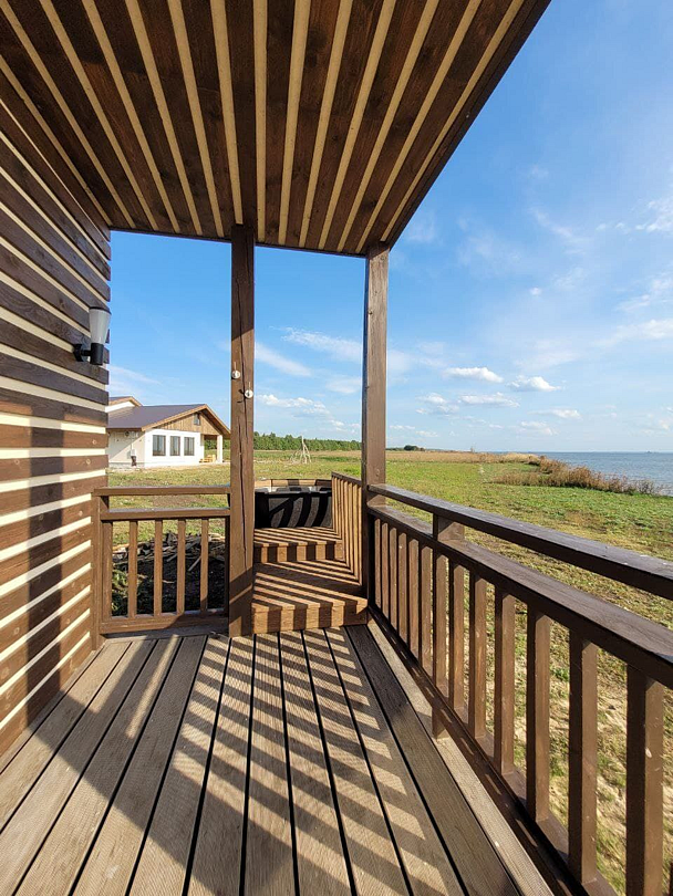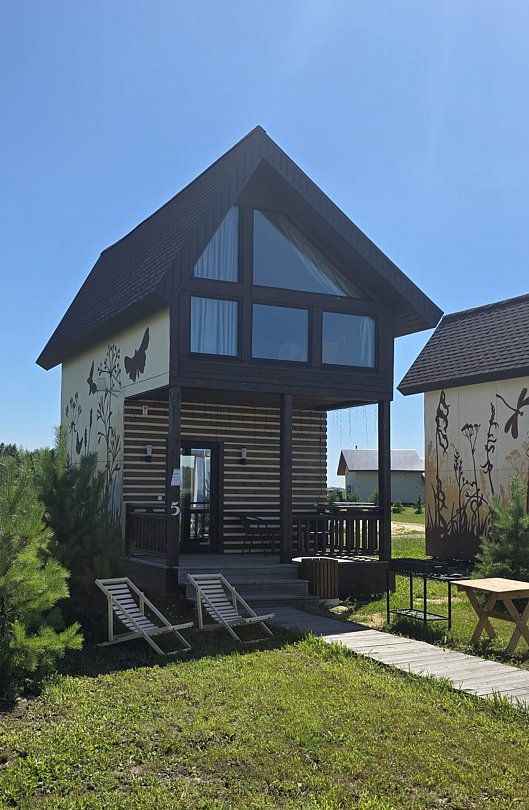 Дом №2 с большим балконом 4 взрослых + 2 ребёнка (бесплатно). Мангальная зона (мангал, уголь, розжиг, стол разделочный), завтрак (в домик или в кафе), детская площадка, футбольное, волейбольное поле (мячи предоставляются), большая территория для прогулки, рыбалка (снасти для рыбалки ваши).