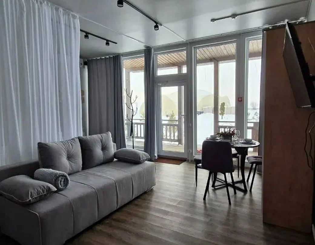 В домике есть: Wi-Fi Телевизор с функцией смарт, музыкальная колонка с караоке, холодильник, микроволновая печь, чайник, посуда, вода, чай, кофе, соль, перец, сахар, спальные места повышенной комфортности, гигиенический набор, халаты, тапочки.