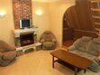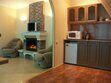 Кухня, холодильник, микроволновая печь, камин, санузел, большая двуспальная кровать, диван и два кресла, телевизор, шкаф, тумбочки.