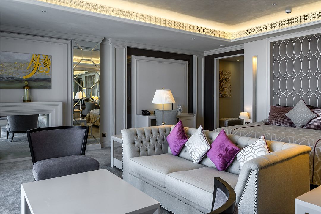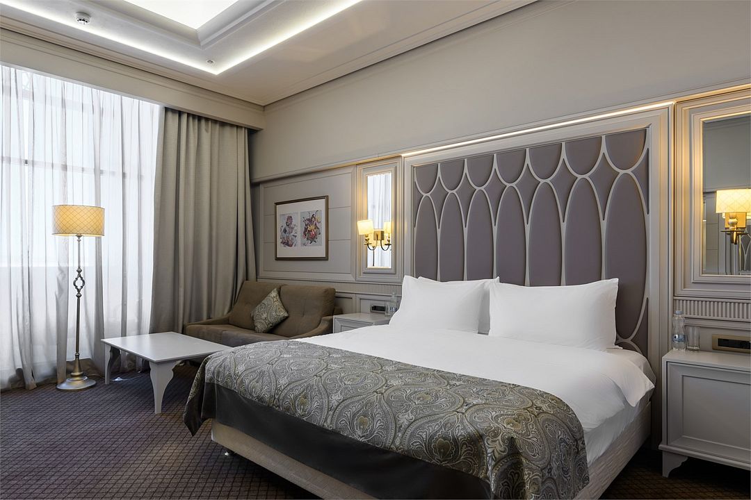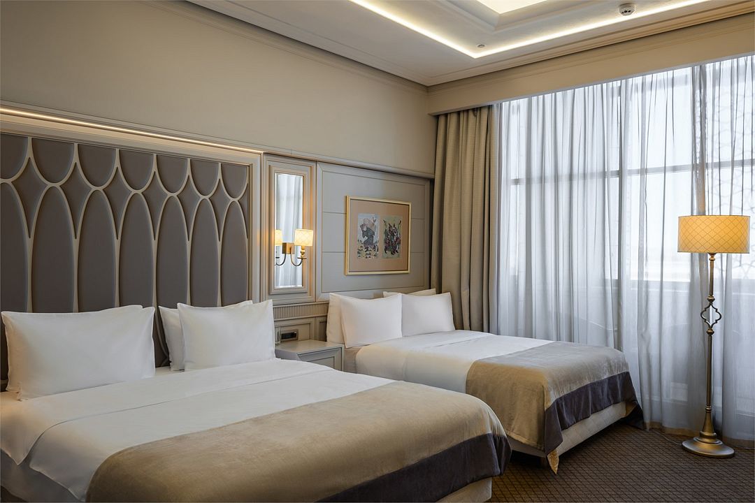Стильный и просторный номер для гостей вместимостью до 5 мест (2 взрослых, 2 детей до 15 лет и 1 ребенок до 5 лет), позволит максимально ощутить всю полноту гостеприимства!