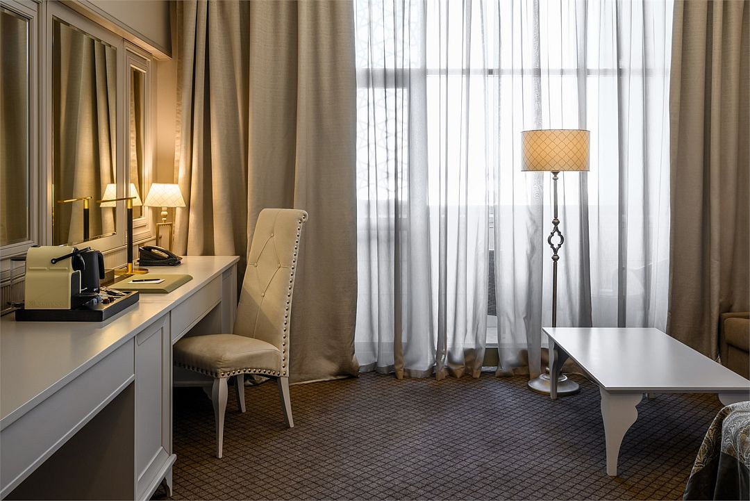 Номер предлагает прекрасный вид на р. Волгу. Каждый из таких номеров имеет балкон, на котором оборудована зона для отдыха.
