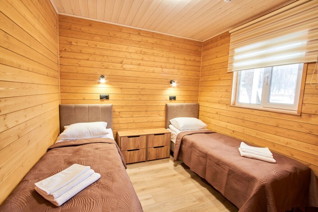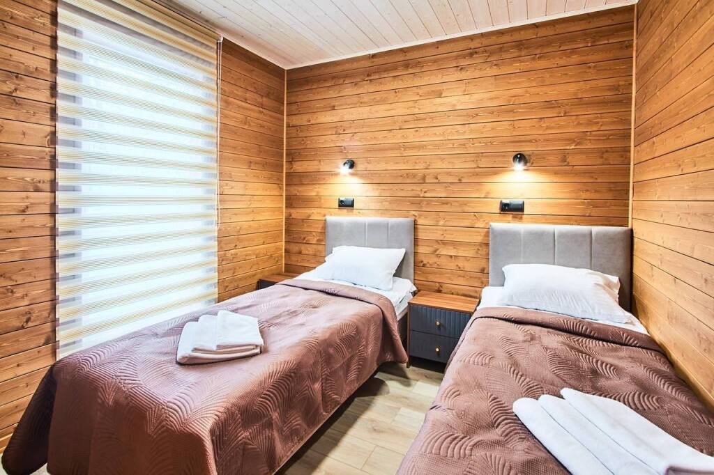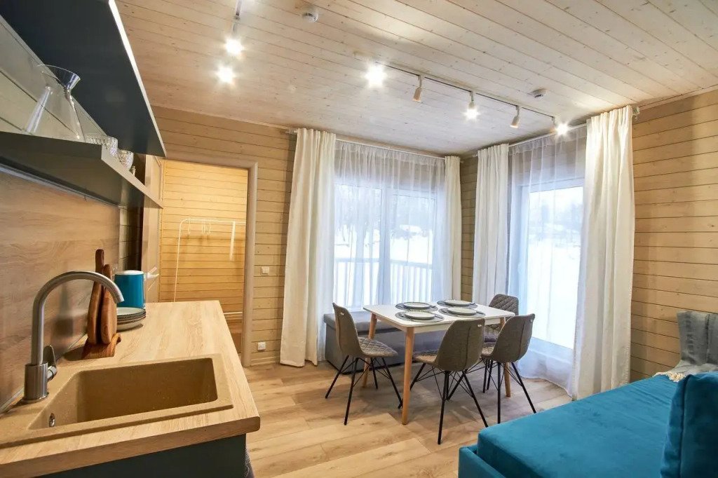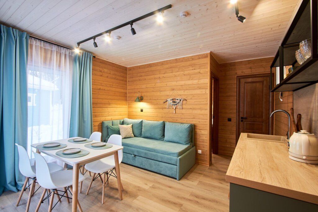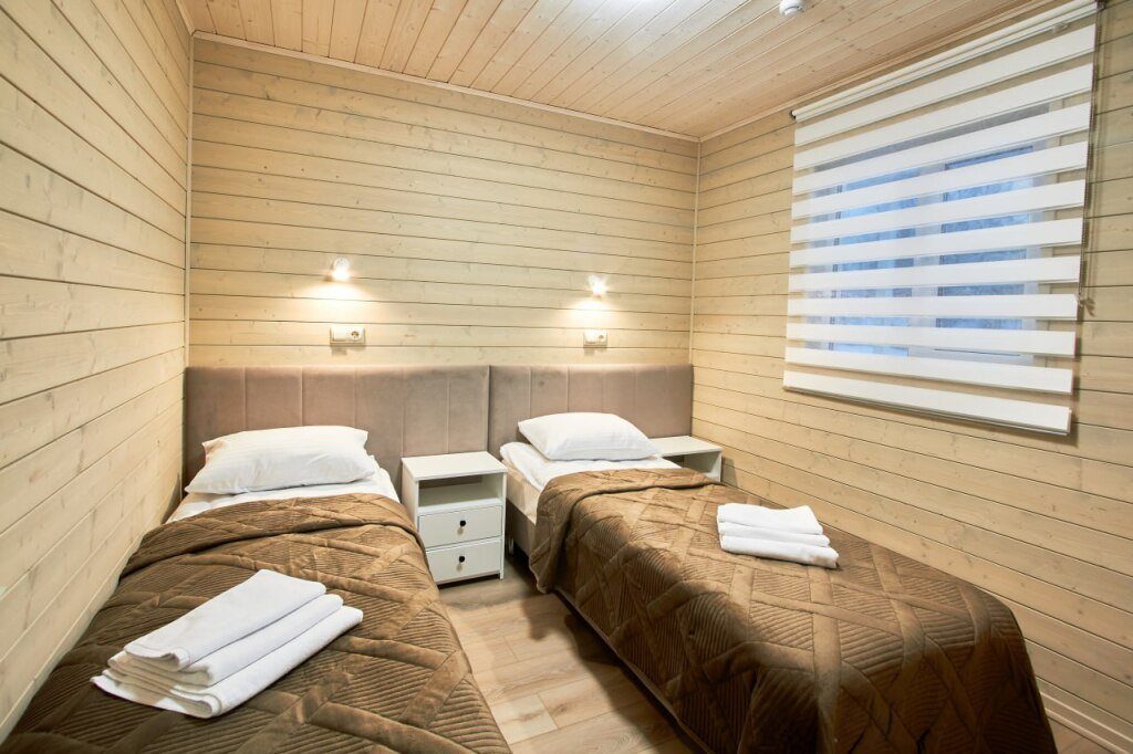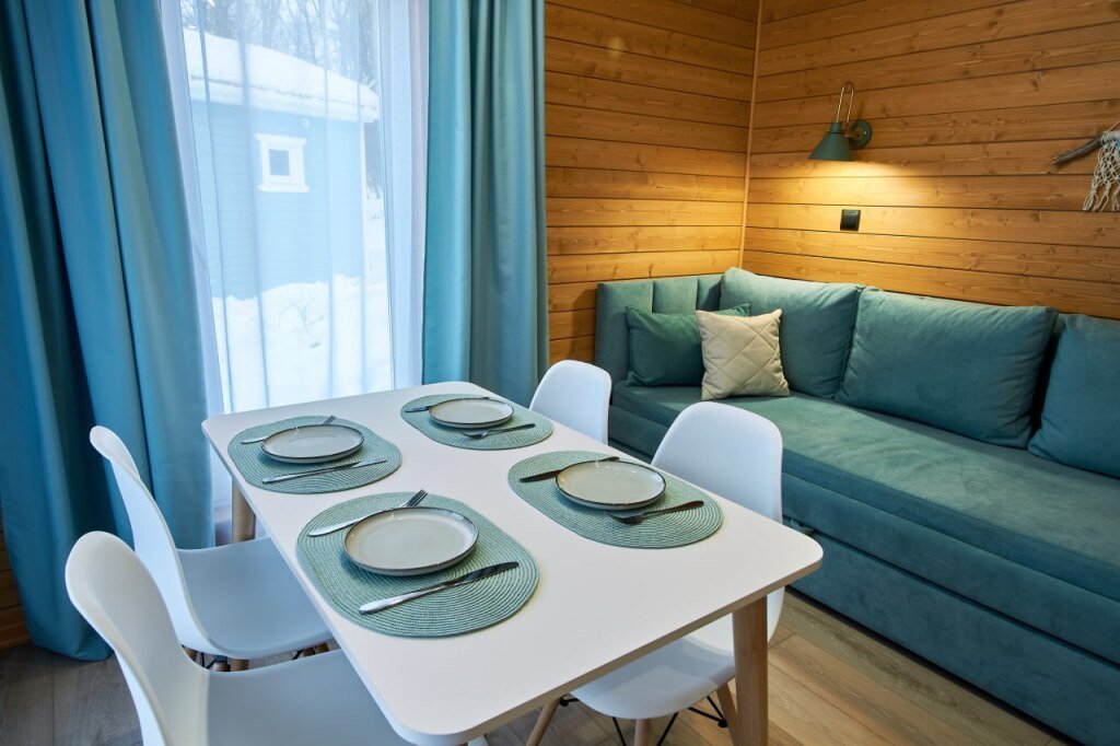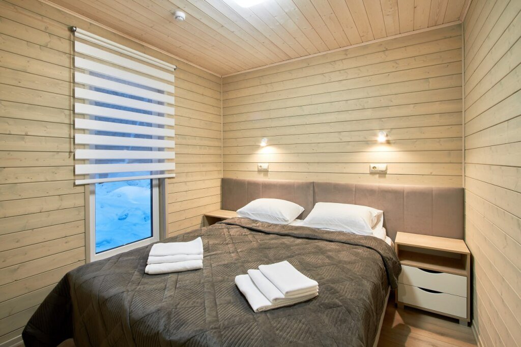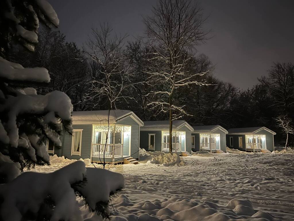 Это отдельно стоящие друг от друга дома, с индивидуальным отоплением. Всего 10 домов: шесть 6ти местных, четыре дома 4х местные. В домах есть с/у с душем, кухня гостиная с раскладным диваном с дополнительными полноценными местами. Кухня оборудована необходимым инвентарем: посуда, плитка, холодильник, раковина, чайник.