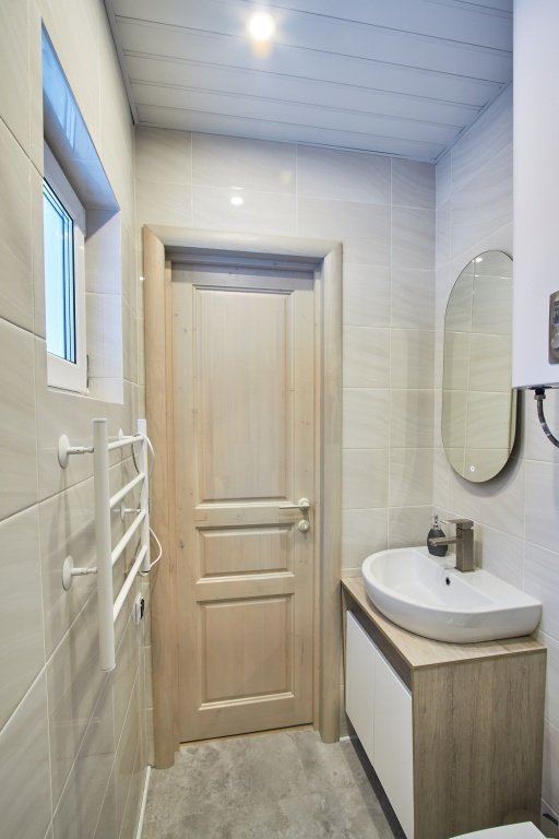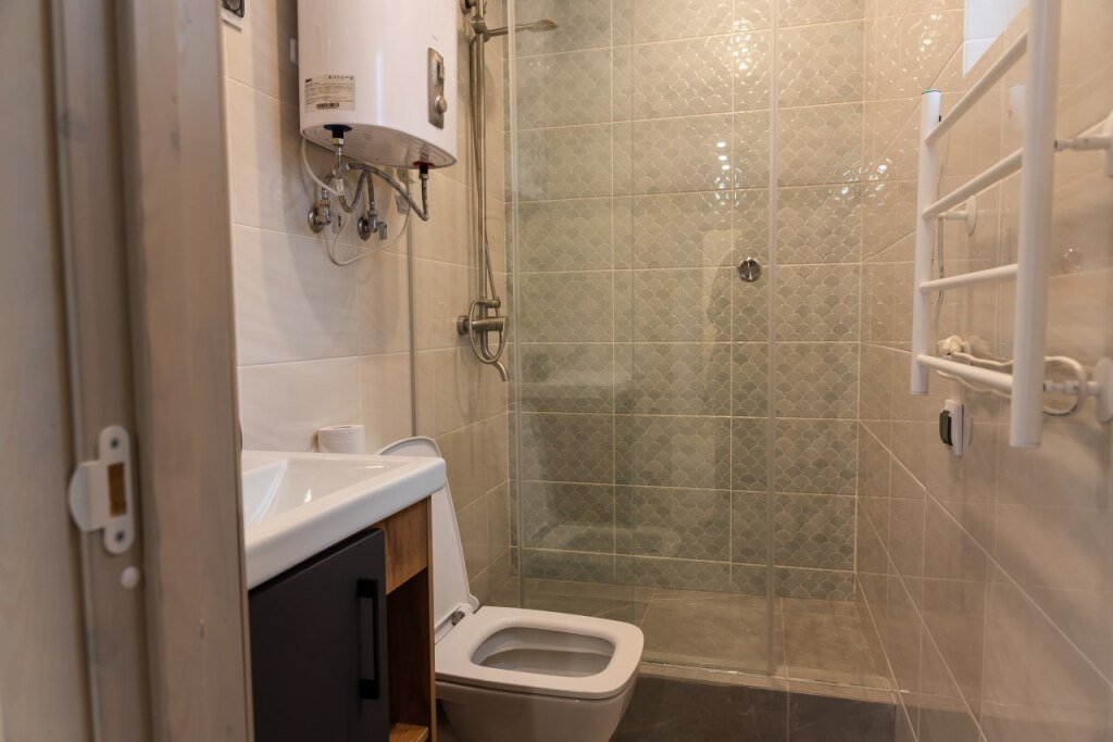 В туалете есть фен, туалетная бумага, мыло, полотенца и тапочки.
