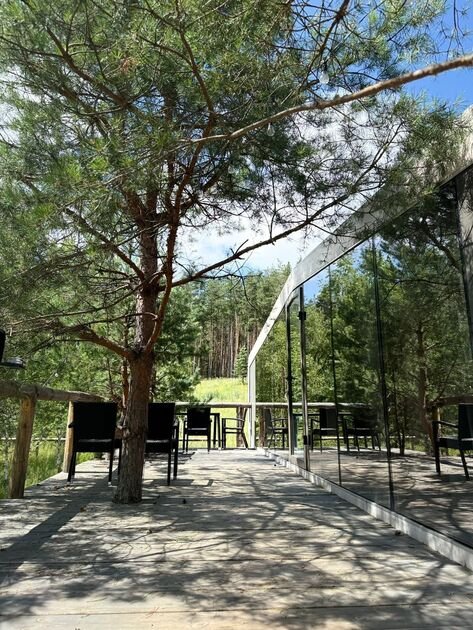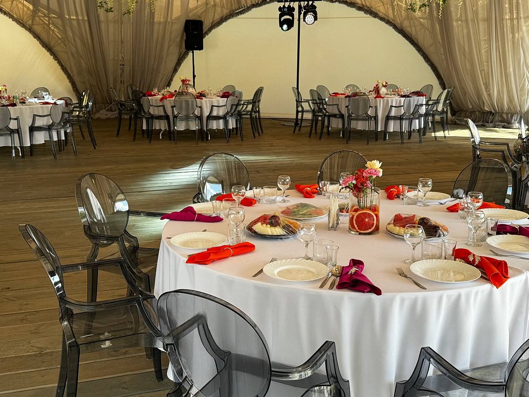 На территории клуба есть большой арочный шатер, где современный комфорт сочетается с природными видами, обеспечивая незабываемую атмосферу, а также игровые зоны, террасы, костровые зоны для вечернего отдыха.