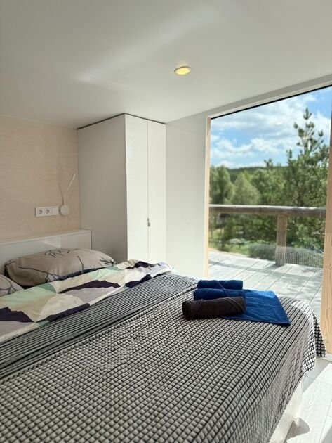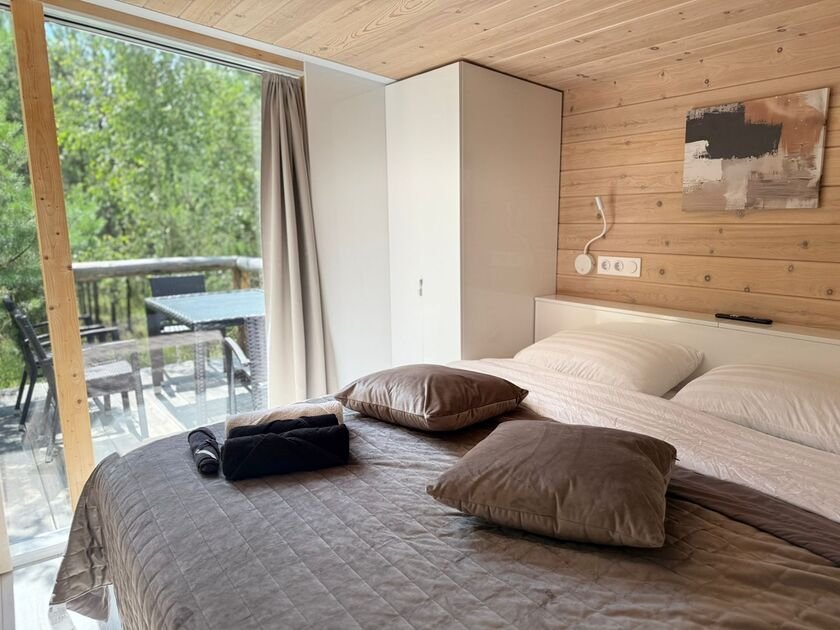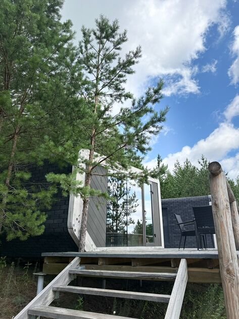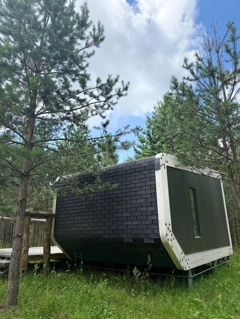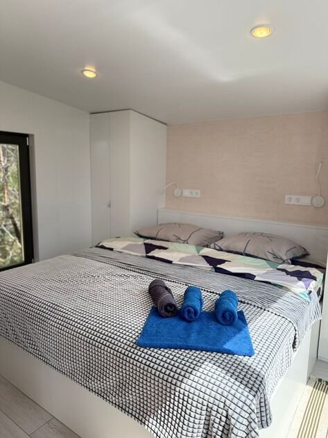 Глэмпинг — идеальное место для отдыха. Здесь есть уютная спальня с удобной двуспальной кроватью и матрасом ASKONA. В доме предусмотрен полноценный санузел с душевой кабиной. В тамбуре-прихожей расположен открытый шкаф, где хранятся верхняя одежда и обувь.
