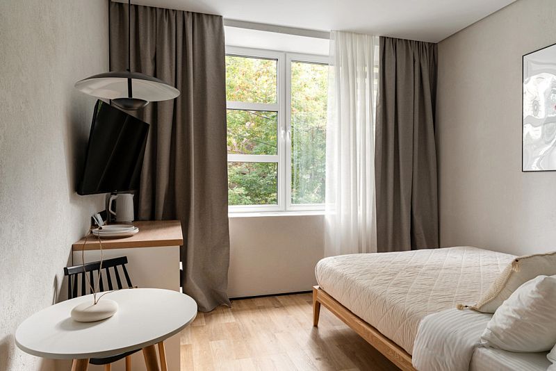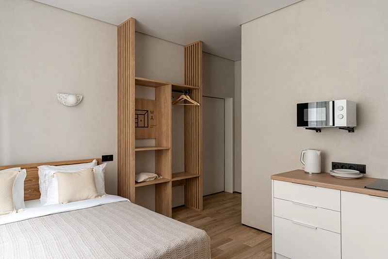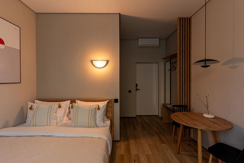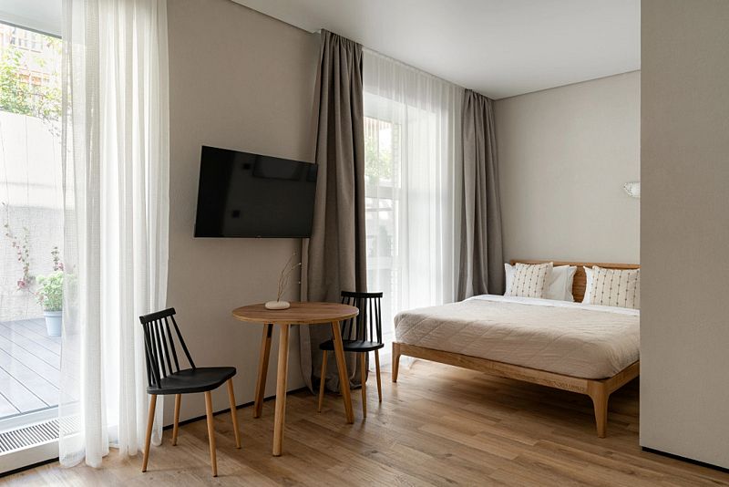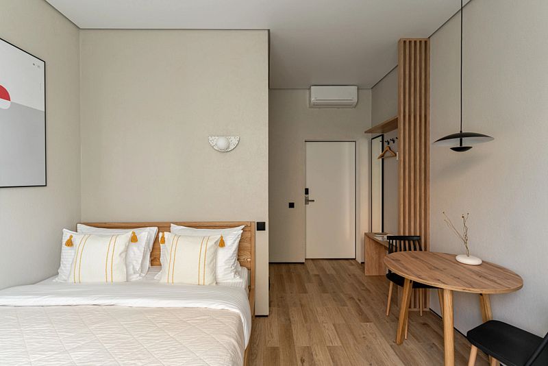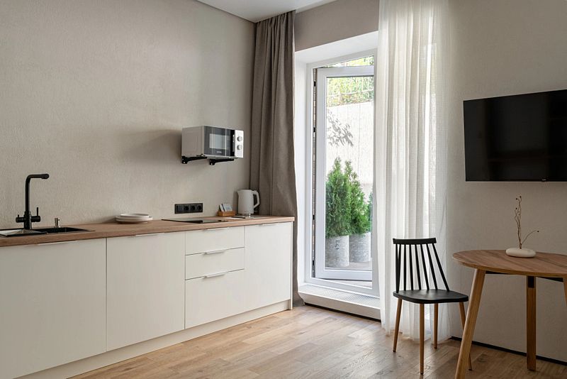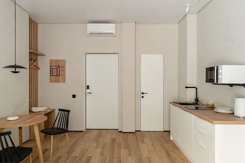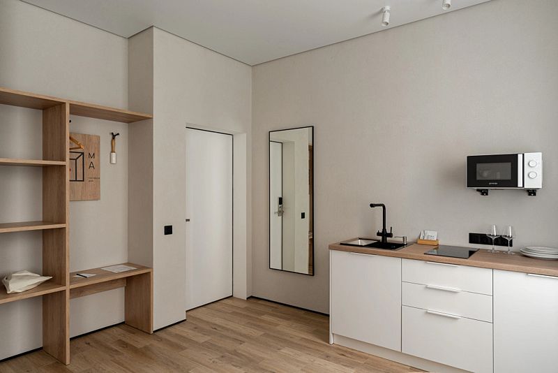 Каждый номер оснащён оборудованной кухней, ванной комнатой, удобной мебелью и зоной для отдыха и сна, в которой также будет удобно работать. Большие окна дают много естественного света.