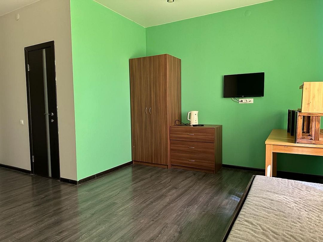 Рассчитан на проживание четырёх-пяти человек. В номере санузел, пять односпальных кроватей, большой стол, гардероб, комод, телевизор, чайник.