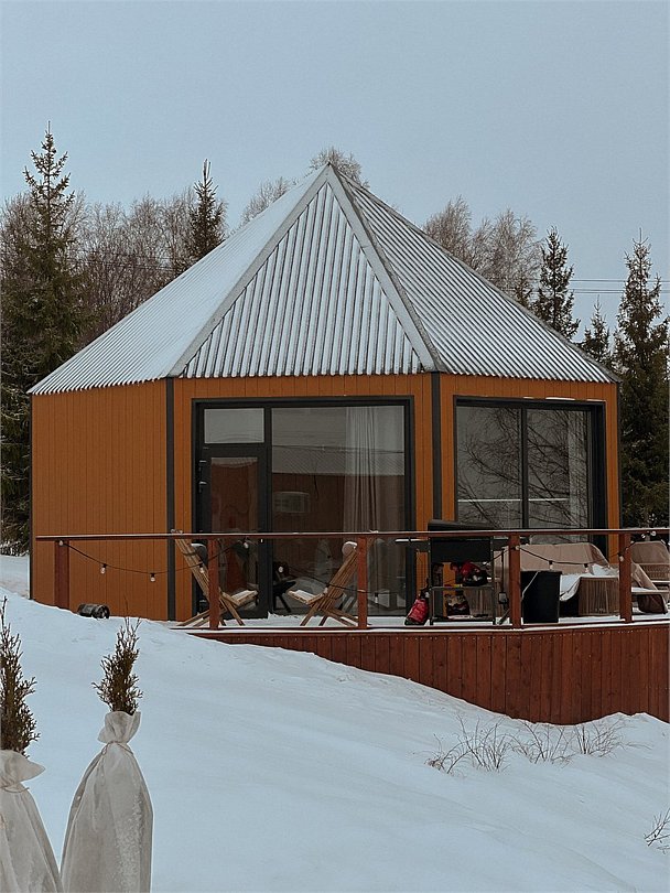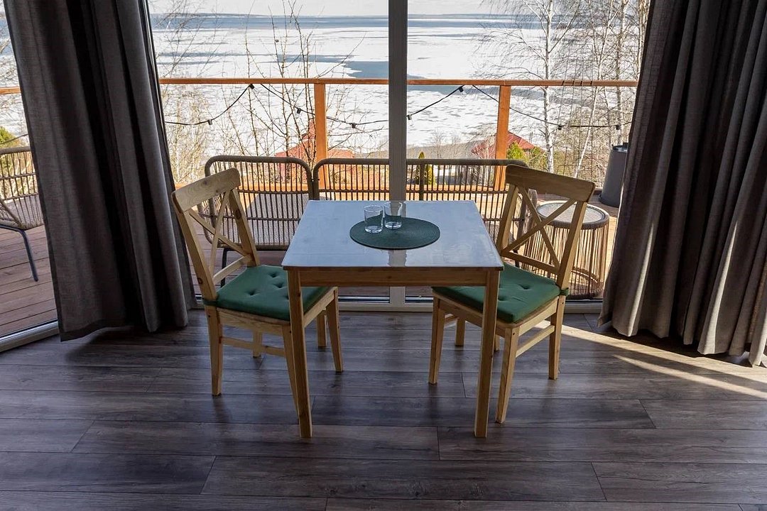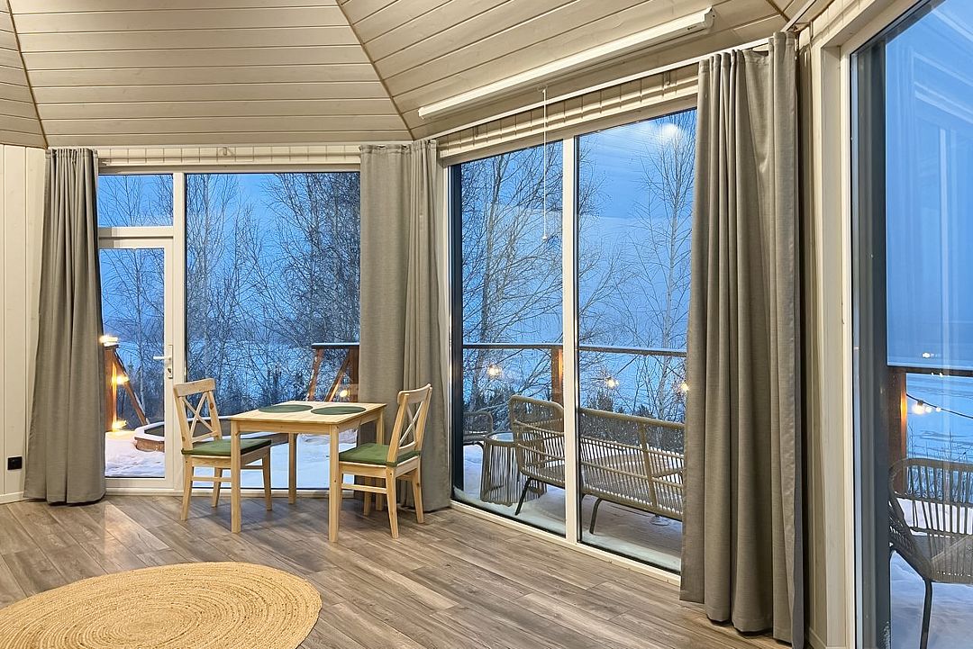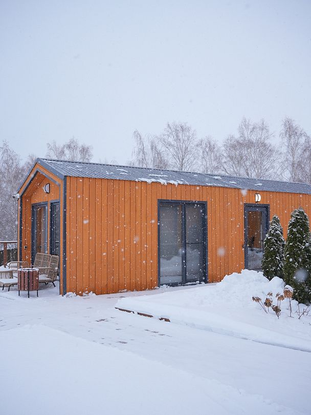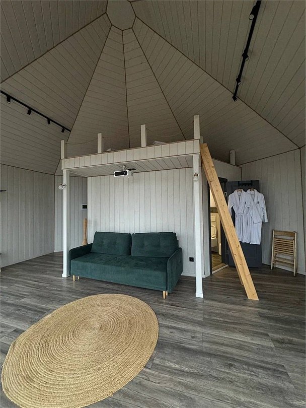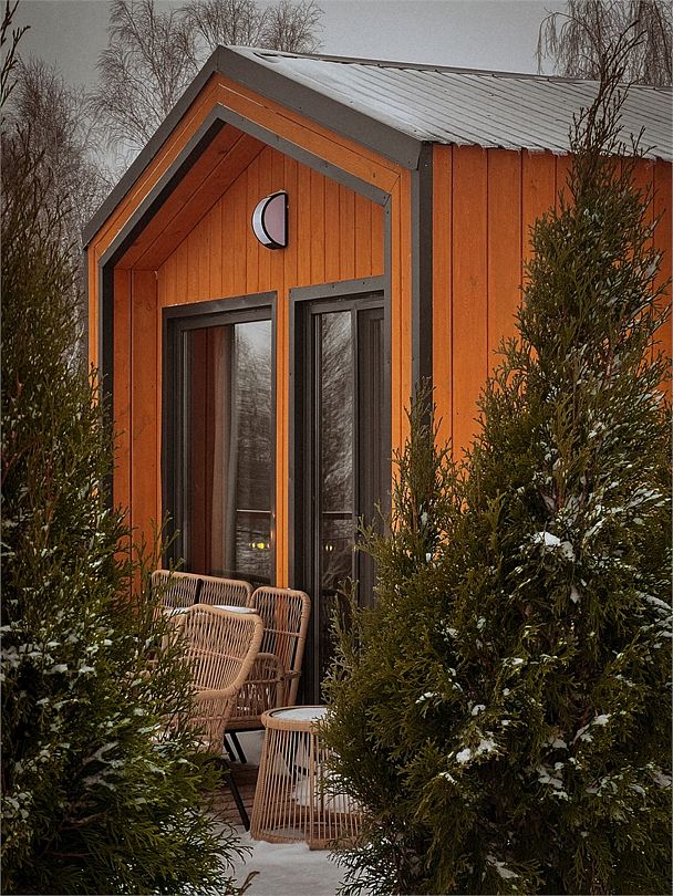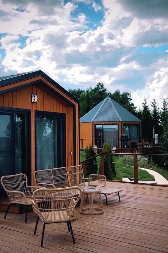 Барн хаус — уютные благоустроенные домики с террасой, рассчитанные на 2–4 человека. Каждый домик оснащен собственной террасой с видом на Камское море и японской бочкой «фурако».